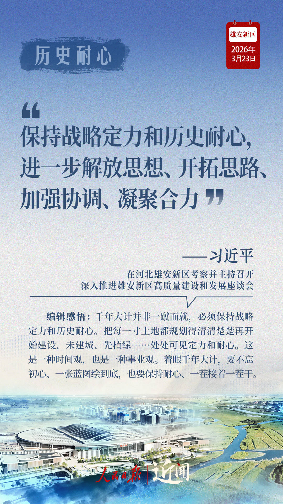 9年时间,从一块地到一张图,再到一座城,“党中央始终给予最大的希望”;从第一次到雄安时在安新县主持召开的一场小型座谈会,到高标准高质量推进雄安新区建设座谈会,再到深入推进雄安新区高质量建设和发展座谈会,一步一个脚印,刻印下现代化“未来之城”的拔节生长。