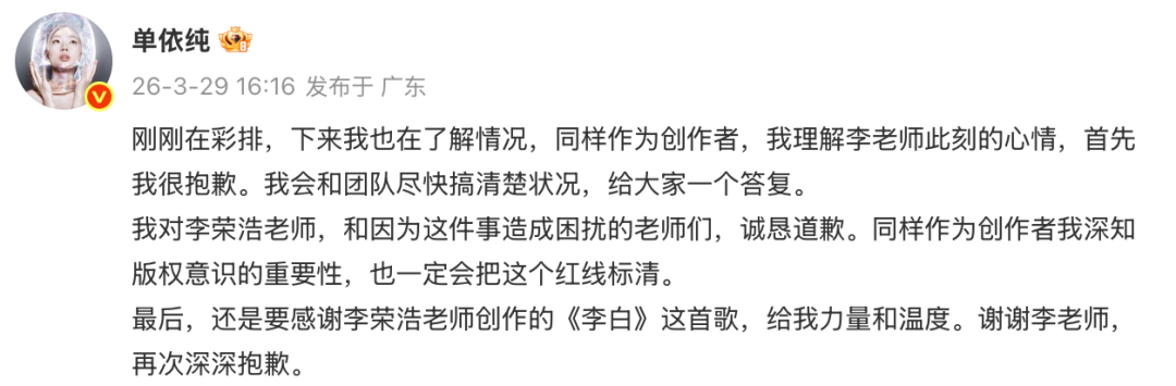 3月29日,单依纯发文回应李荣浩公开喊话其强行侵权演唱《李白》,全文如下:
