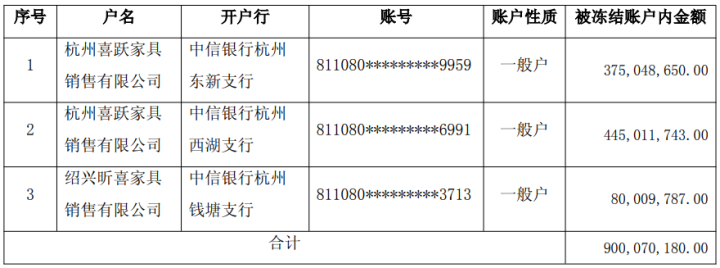 三个自行冻结账户涉及金额约9亿元,加上被非法挪用的1亿元,两者累计超过10亿元,占公司最近一期经审计净资产的26.54%,占公司最近一期经审计货币资金的42.69%。