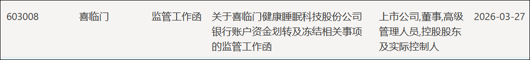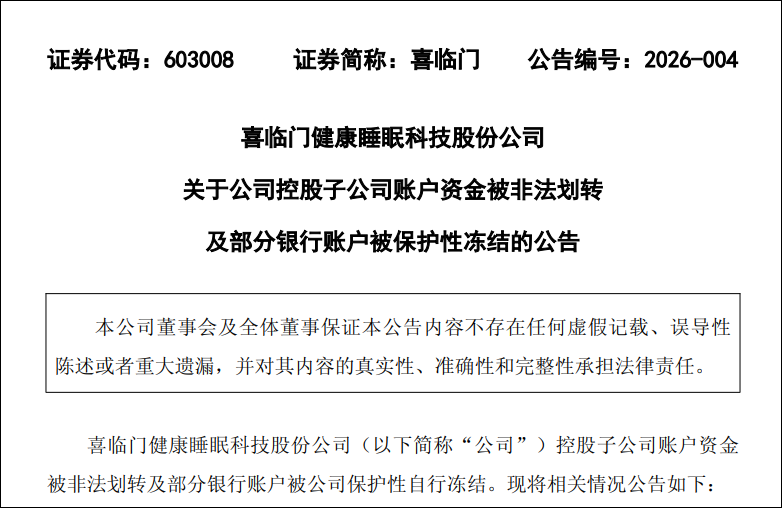 喜临门公告显示,近日,公司发现下属控股子公司喜途科技有限公司的银行账户资金被非法划转,划转资金累计1亿元,该账户系喜途科技开设在某国有银行杭州分行的一般户。经公司核查,发现相关人员涉嫌利用职务之便,非法挪用公司资金。
