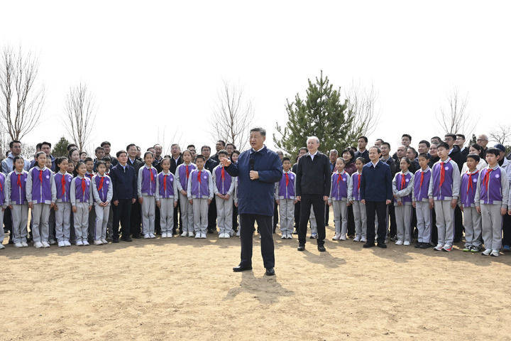 3月30日,党和国家领导人习近平、李强、赵乐际、王沪宁、蔡奇、丁薛祥、李希等来到北京市昌平区百善镇参加首都义务植树活动。这是习近平同在场的干部群众、少先队员亲切交谈。新华社记者 谢环驰 摄