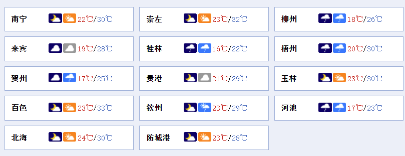 南宁市:阴天、有短时小雨,明天白天,多云间阴天,偏南风2~3级,最低气温22℃,最高气温30℃。