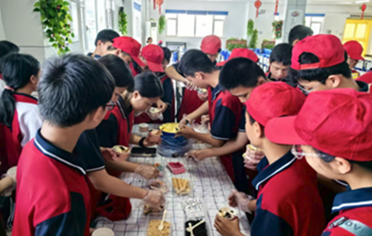 活动中,伊利工厂的“研学导师”全程带队,用通俗易懂的语言,讲解伊利品牌故事、公司发展历程,介绍从原料到成品的全链条生产工艺。透过全透明生产车间参观平台,同学们可以近距离观摩冰淇淋的生产全过程——从原料筛选、杀菌加工,到快速冷冻、包装出厂,智能化生产线高速运转、机械臂精准协作,让同学们近距离直观感受现代工业,在潜移默化中培养严谨的科学态度。冰淇淋DIY。