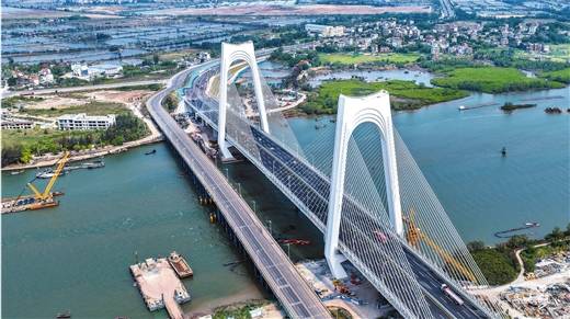 3月31日,平陆运河沙井钦江大桥正式建成通车。该桥全长896米、主跨270米,大桥设计时速60公里,桥面宽40米,采用双向8车道,结构安全等级一级,通航净高19.1米、通航净宽234米,可满足运河5000吨级船舶安全通航需求。