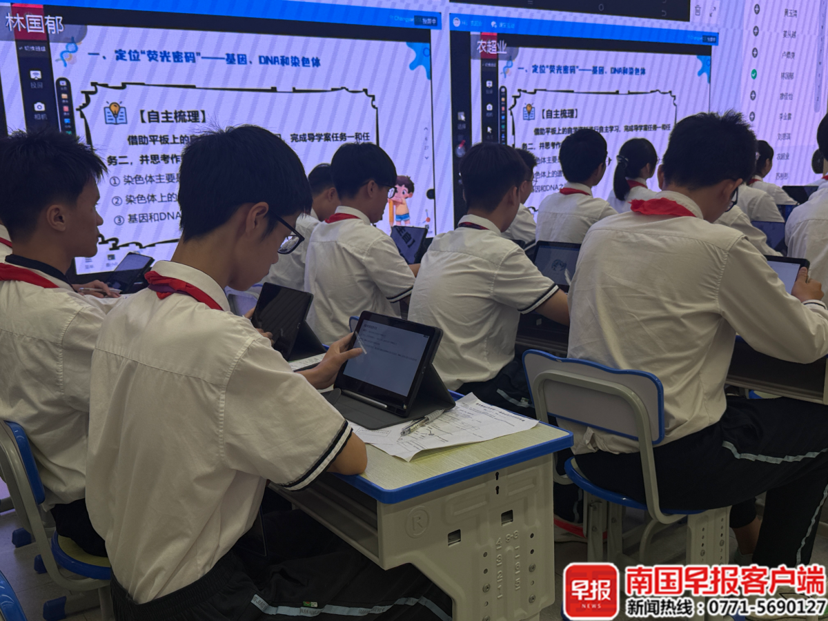 其中,刘洋老师执教的生物课《数智解构荧光密码——基因在亲子代间的传递》成为全场亮点。遗传学知识是初中生物重点,但微观抽象,学生不易理解。于是,刘洋从一种常见的观赏鱼斑马鱼切入,引发学生对知识点的兴趣。这种经常跟随航天飞船登上太空的观赏鱼,在人类掌握了其变色遗传基因后,被培育出了粉色、绿色的荧光品种。课堂上,他借助AI 3D模型与模拟实验,将细胞核、DNA、基因的大小关系立体拆解、层层展示,让微观知识可视化。同时,课堂上引入平板互动系统,实时显示课堂小作业的正确率,哪道题错得多、哪个知识点掌握薄弱,一目了然,老师可据此重点讲解。课后,陈同学告诉记者:“遗传知识很有趣,但也很抽象,像细胞核、DNA、基因谁大谁小这样的知识点,加入3D模型后更好记了。”