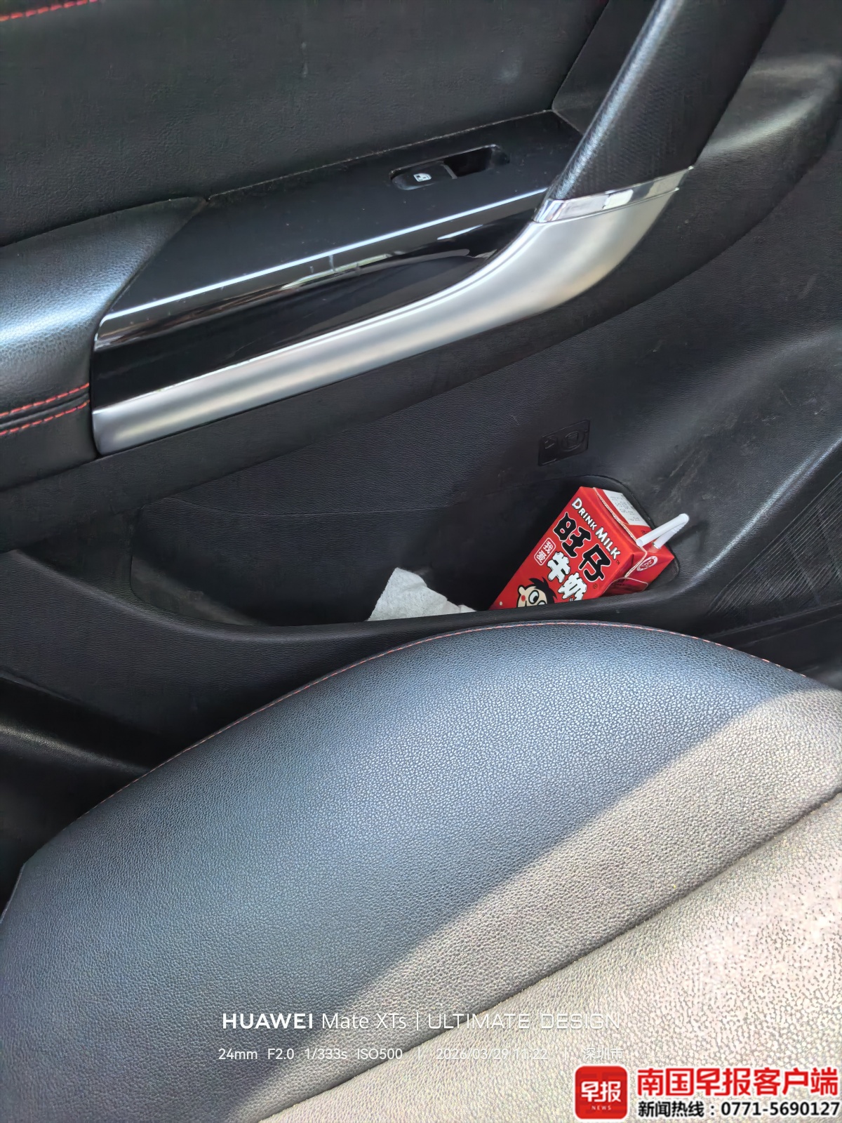 赵先生乘坐的曹操专车车厢内有喝过的牛奶盒。