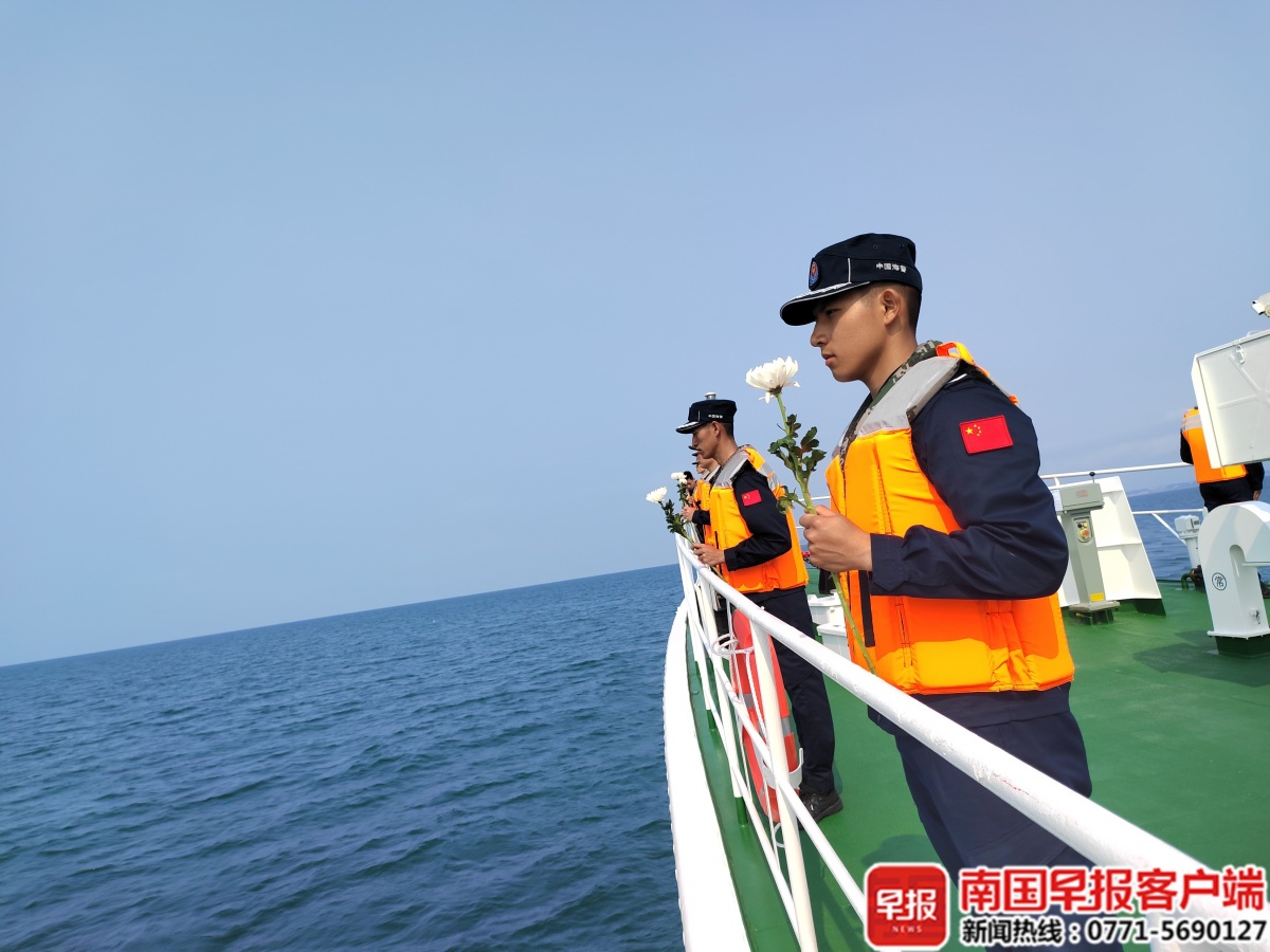 浩气长存,缅怀英烈!日前,广西海警局舰艇编队缓缓驶入防城港珍珠湾海域。甲板上,执法员们列队肃立,手中的白花在海风中轻颤,大家沉痛缅怀在这片海域壮烈牺牲的战友谯禾林。
