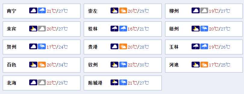 南宁市:阴天到多云、早上有小雨和雾,东南风2~3级,最低气温21℃,最高气温27℃。