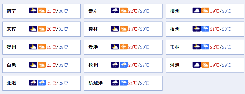 南宁市:多云,东北风2~3级,最低气温21℃,最高气温30℃。