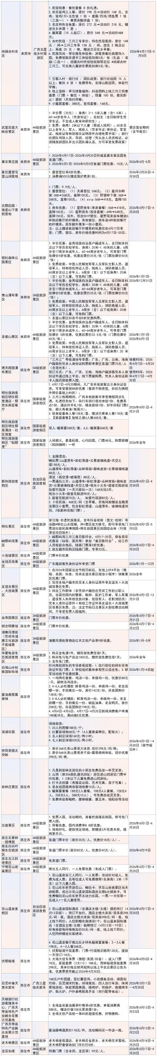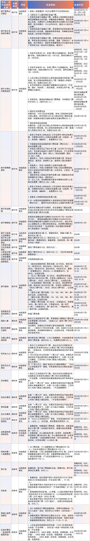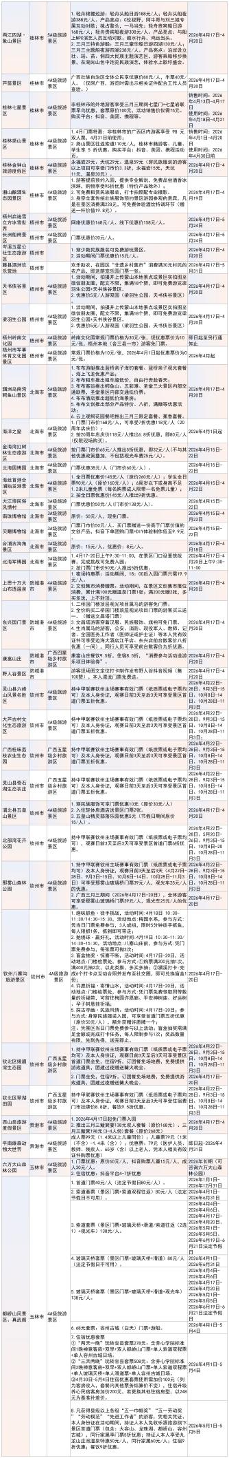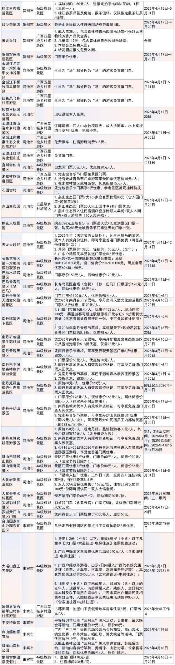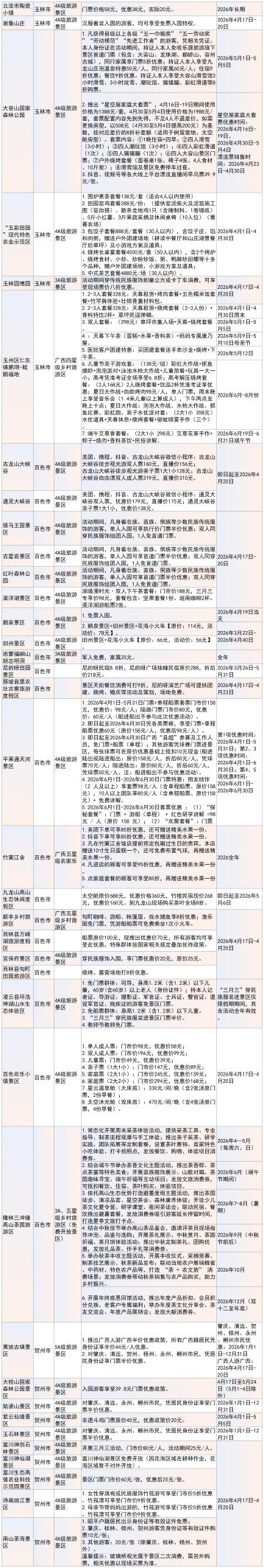 “春假来广西,畅游畅购三月三”景区、乡村旅游区优惠活动信息一览表。