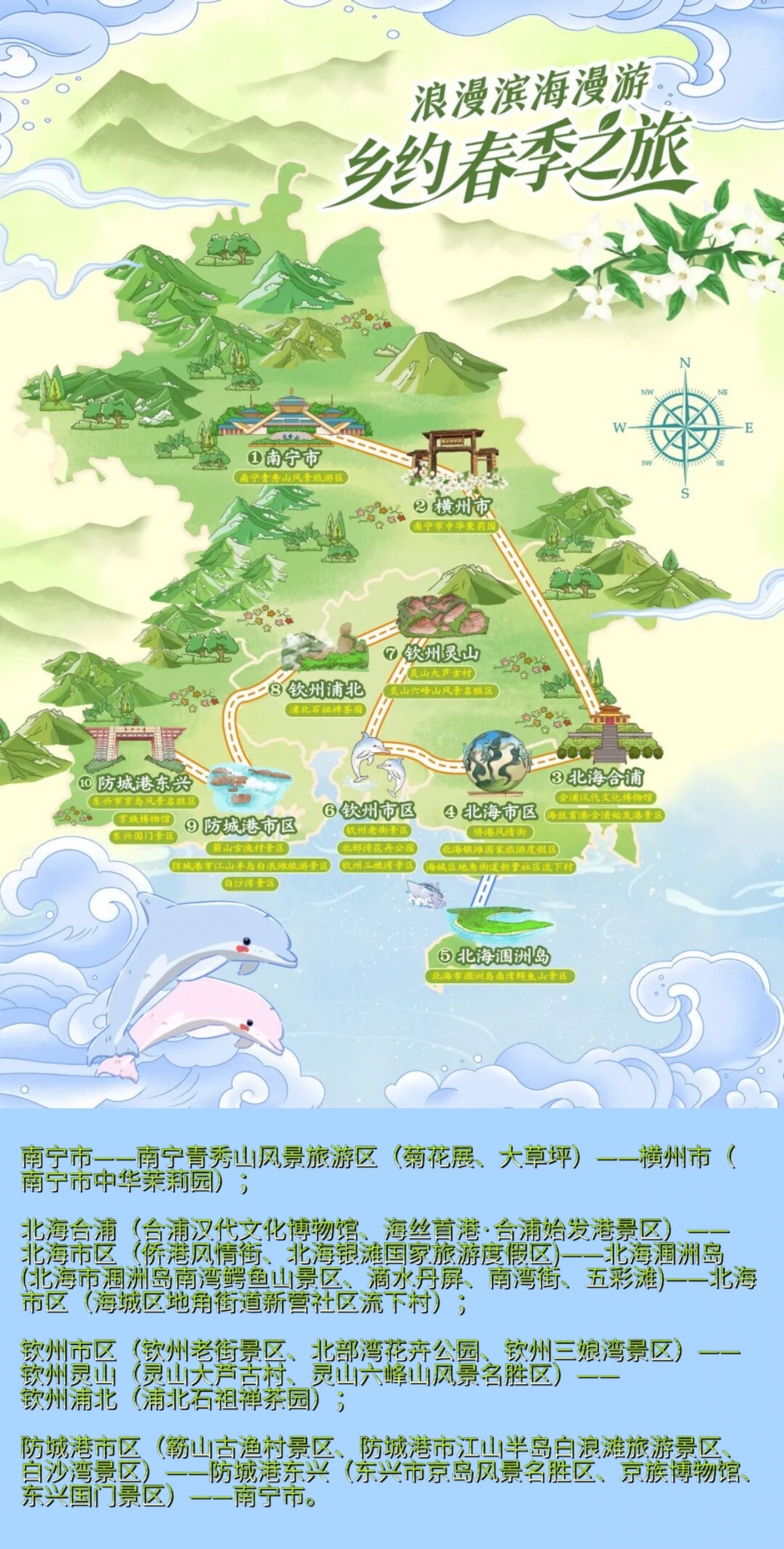 线路以“浪漫北部湾 ‘乡’约滨海游”为主题,书写北海、钦州、防城港三城的春日韵律。游客可在北海银滩邂逅春日碧波,于涠洲岛赏火山奇观、滴水春韵;到钦州三娘湾偶遇跳跃的中华白海豚,探访灵山大芦古村百年古韵;在防城港漫步白浪滩,探访京族风情,于东兴国门之下感受异域脉搏。从现代都市走向古老渔村,从碧波银滩漫步至红树林秘境,这条线路将带游客遇见北部湾最鲜活、最诗意的春天。