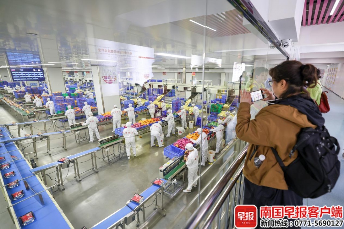 游客参观柳州螺蛳粉工厂生产线。