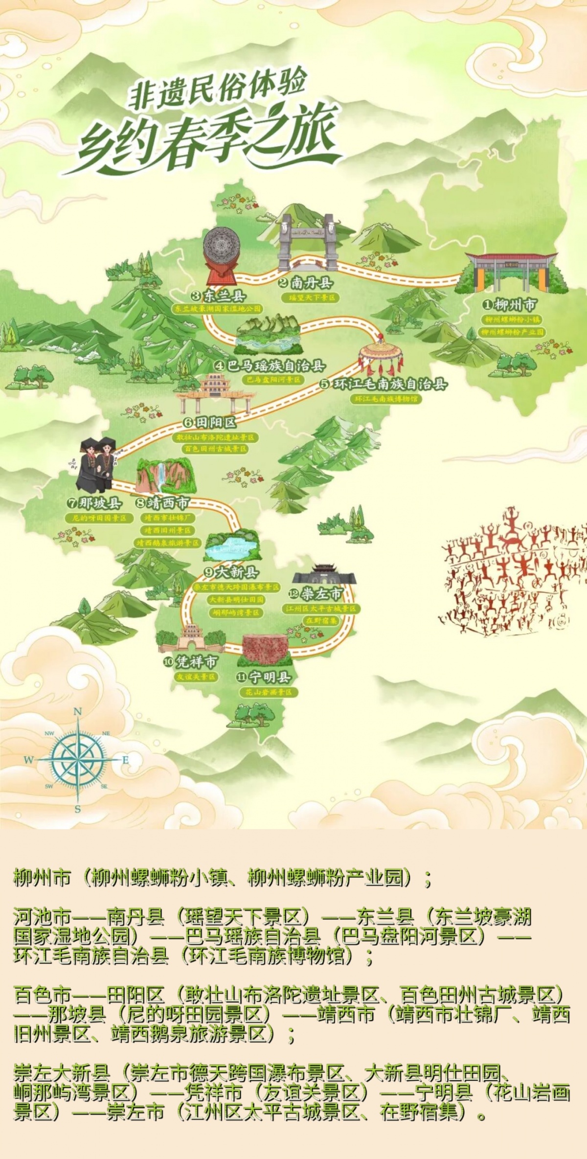 线路串联柳州、河池、百色、崇左四地,融合喀斯特山水、民族非遗、边关风情等多元体验。游客可深入南丹白裤瑶寨感受铜鼓传韵,在靖西旧州亲手制作绣球,到宁明花山探秘千年岩画,于大新德天瀑布感受跨国瀑布的磅礴气势。一路踏春而行,尽览边关山水之美,尽品八桂人文之韵。