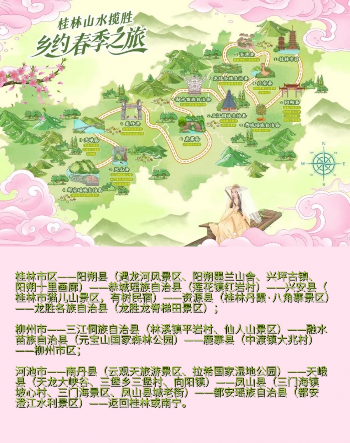 线路以“山水如画 春意盎然”为主题,串联桂林、柳州、河池三地乡村旅游精华景点。春日行走其间,可尽赏桃花、梨花、杜鹃等绚烂花海,漫步水墨意境的兴坪古镇,领略龙胜梯田春水如镜的绝美风光,探秘凤山三门海灵秀神奇的水上天窗。行程涵盖阳朔遇龙河风光、恭城红岩村梨花、资源八角寨丹霞奇观、三江侗族大歌等多元体验,是一条集自然观光、乡村体验、摄影采风于一体的春季深度游线路。