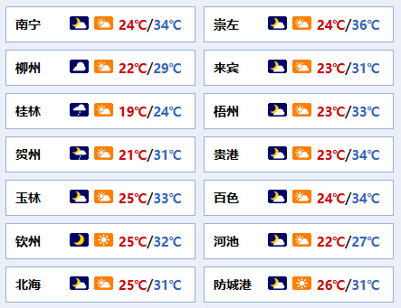 南宁市:多云间晴,偏南风2~3级,最低气温24℃,最高气温34℃。