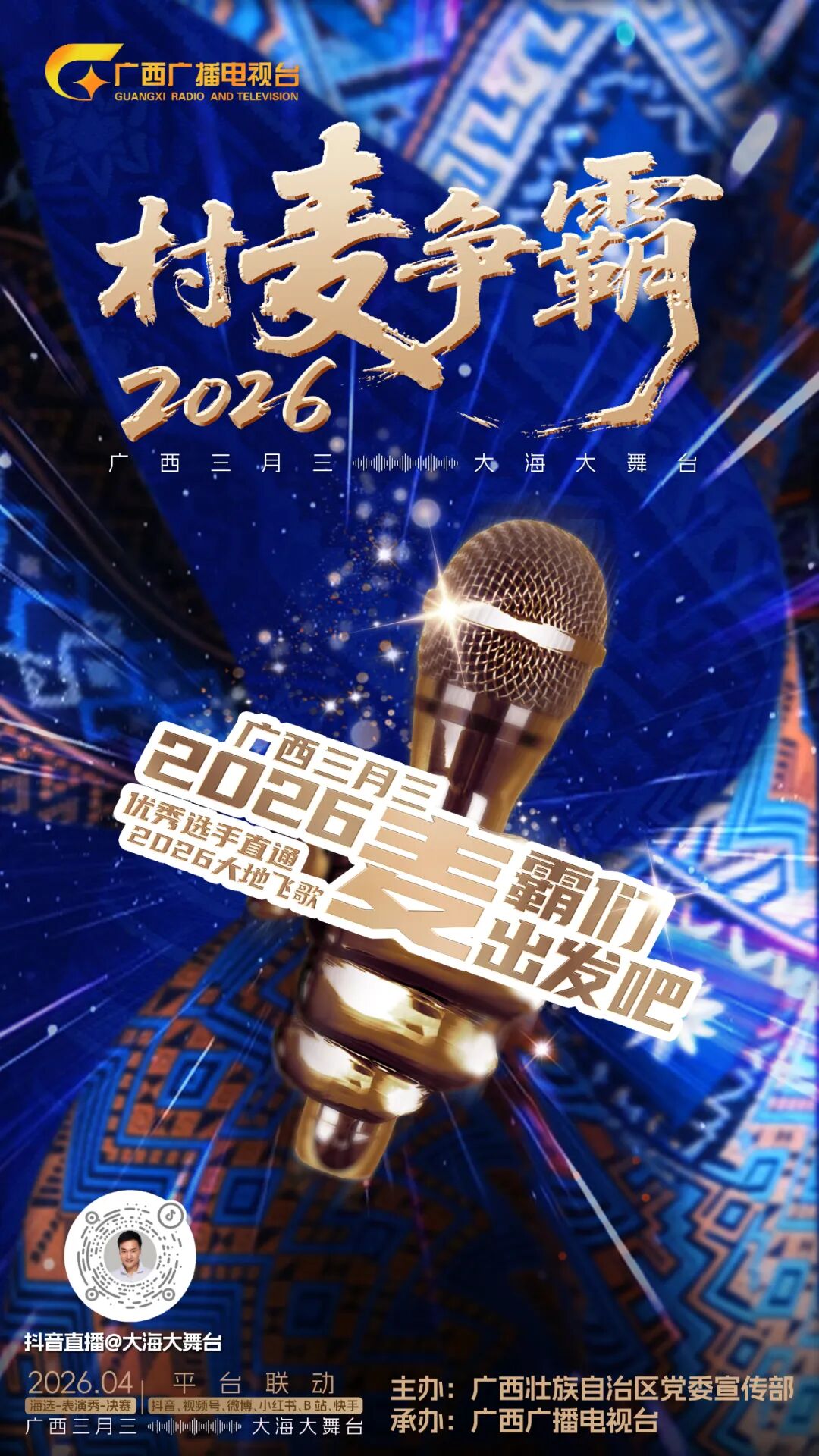 继“村BA”与“村超”点燃乡村体育的激情之后,八桂大地即将迎来一场视听盛宴。4月10日-4月12日,作为2026年“广西三月三·八桂嘉年华”重要项目之一的“村麦争霸2026”海选将正式开唱。