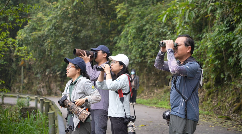 在那坡县一处观鸟点,手持望远镜、长焦相机的游客。