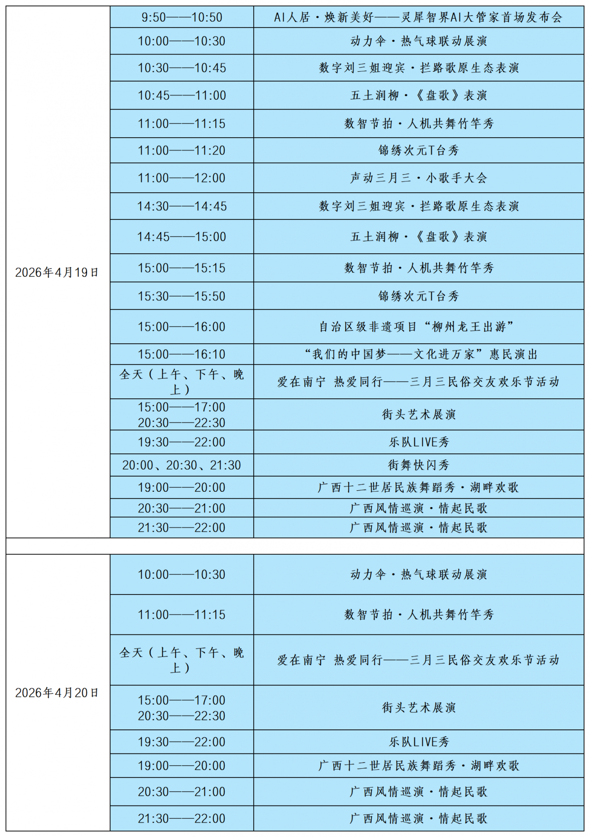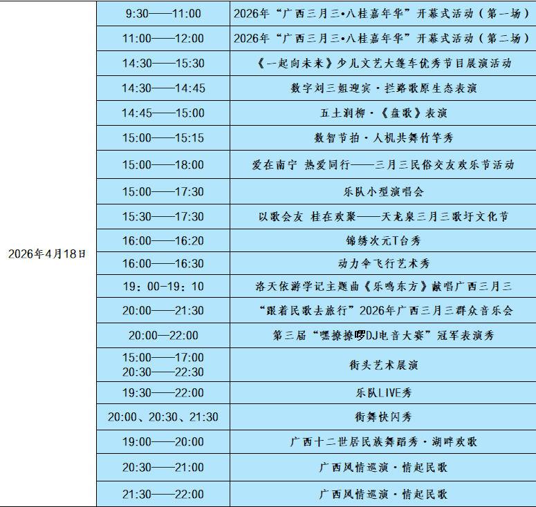 南宁市民歌湖 出入口分布: 1.汇歌路(民歌湖西南门) 2.金浦路(民歌湖国际音乐小镇西门) 3.金浦路(民歌湖西北门) 4.竹溪大道(民歌湖国际音乐小镇曲水桥) 第一场入场时间:4月18日(星期六)8:45 第一场活动时间:4月18日(星期六)9:30—10:30 第二场入场时间:4月18日(星期六)10:30 第二场活动时间:4月18日(星期六)11:00—12:00 (具体演出信息,以当天演出为准) 1.观众须提前在广西云客户端进行实名制预约,每位用户最多可预约3张入场券。 2.预约成功后将收到短信通知,请关注短信信息。 3.收到预约成功短信后,可于4月18日前到广西日报社凭预约二维码、身份证领取纸质入场券;或于开幕式当天(18日上午)前往开幕式现场"入场券预约领票处",凭预约二维码、身份证领取纸质入场券。 4.观众须携带身份证及纸质入场券,向检票口工作人员提供信息后方可入场。 错过了开幕式进场机会? 没关系,精彩仍在继续! 4月19日至20日 民歌湖畔将继续开展各类丰富演出活动 无需门票,随到随看! (具体演出信息,以当天演出为准) 1.请听从现场工作人员引导文明参与活动,切勿喧哗、追逐、攀爬、躺卧、推搡,共同维护现场秩序。 2.高龄老人、残疾人士、未成年人等观众须由健康成年人陪同。 3.请妥善保管好现金、手机等贵重物品,提高防范意识,避免造成财物损失。 4.建议勿携带大型旅行包、大双肩包、行李箱等包裹入场。酗酒者、衣冠不整者,谢绝入场。 5.现场人员密集,手机信号可能会不稳定。如遇各类紧急突发事件,请第一时间向现场工作人员求助,并严格服从工作人员统一指挥、有序疏散,确保安全。 6.禁止携带烟花爆竹、无人机、管制刀具、有毒有害、易燃易爆物品入场,禁止携带宠物入场,严禁携带横幅、灯牌、标语、激光笔、长柄雨伞、饮料、打火机和板凳入场。 这个“三月三” 我们在南宁民歌湖不见不散 一起“趣”玩! 点击图片进入专题 查看更多精彩内容 ↓↓↓