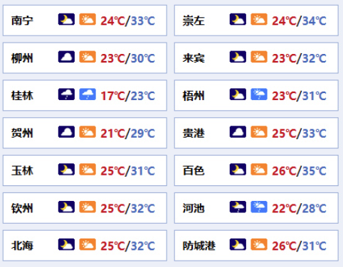 南宁市:多云,偏南风2~3级,最低气温24℃,最高气温33℃。