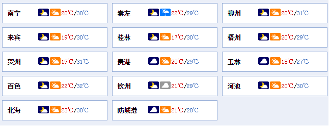 南宁市:阴天到多云,偏东风1~2级,最低气温20℃,最高气温30℃。