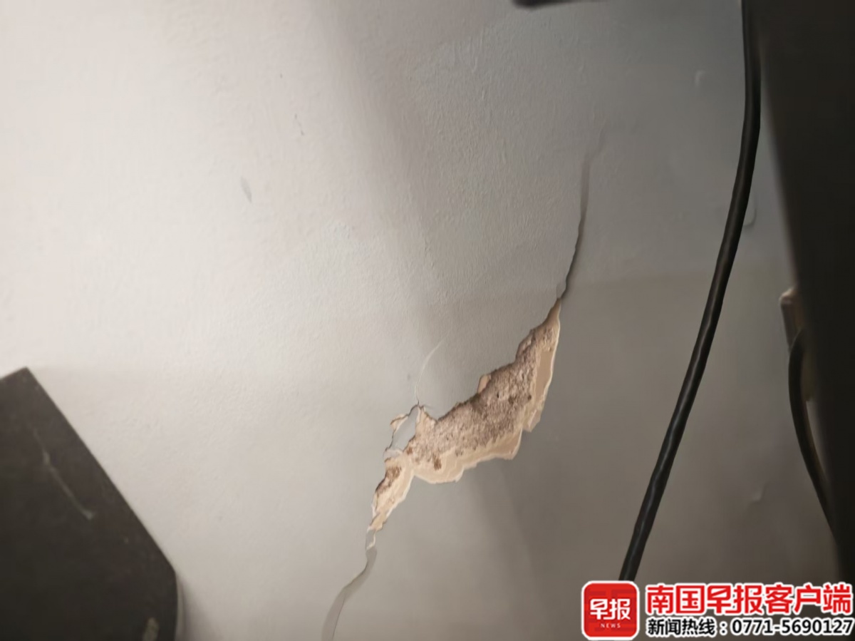 卢先生告诉记者,2019年,他花费8万余元,委托广西中宅建筑装饰工程集团有限责任公司装修一套位于邕宁区大唐世家小区的房屋,双方约定水电质保5年。2022年4月入住后,该套房屋接连出现阳台积水、电视背景墙开裂、墙面爆裂等问题。其间,装饰公司先后两次维修均未能根治,直至2025年才查明,系卫生间水龙头安装问题导致的渗水。