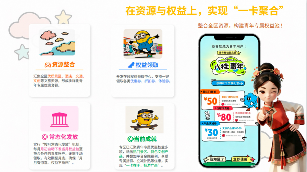 据悉,八桂青年卡依托 “一键游广西” 平台推出,设置独立专属入口,只需一次授权认证、系统自动核验年龄,即可点亮青年专属身份标识,实现精准服务、便捷通行。卡片深度整合广西全域优质资源,打造一站式青年福利聚合平台,涵盖景区、酒店、交通、文创、潮流消费、金融补贴等超多权益,月月自动下发专属礼包,无需手动领取,优惠不断档。
