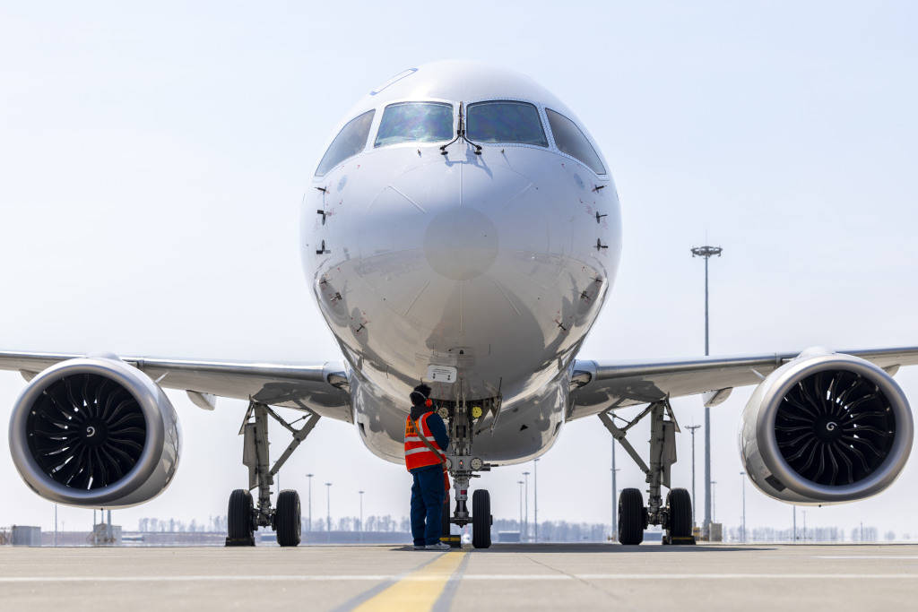 4月15日,搭载140名旅客的MU5631航班平稳降落在哈尔滨太平国际机场,标志着国产大飞机正式投入东北至长三角核心航线。新华社图