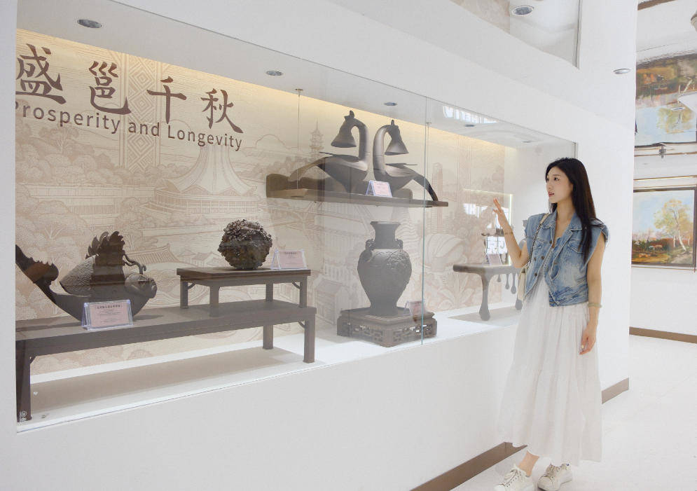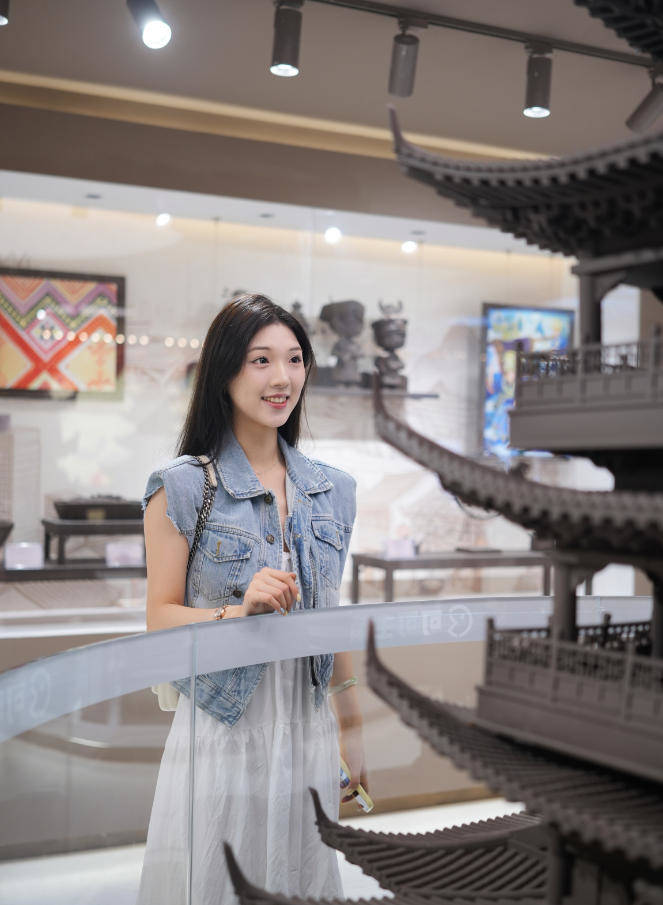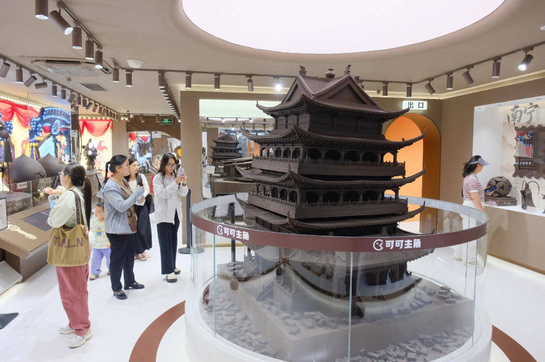 沿着楼梯走上二楼,一座微缩版畅游阁屹立在展厅中央,飞檐翘角间尽显江南楼阁的灵秀之美,仿佛将邕江边的古韵搬到了这方寸展厅之中。周边的展柜里,更是藏着满满的广西元素:邕剧演员的巧克力模型身着精致戏服,眉眼灵动;老友粉、卷筒粉的细节被完美还原;广西坭兴陶的纹理、广西博物馆的羽纹铜凤灯的纹饰、北宋錾花鎏金银摩竭的花纹,都通过巧克力的细腻质感得以再现,让人惊叹于匠人的巧思。广西博物馆的羽纹铜凤灯等文物也化身成巧克力被收入巧克力博物馆。南国早报全媒体记者 冯榆 摄