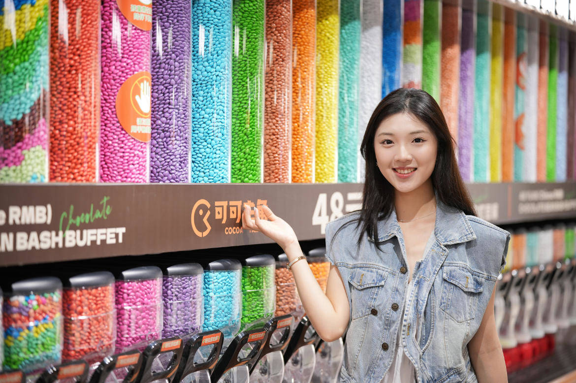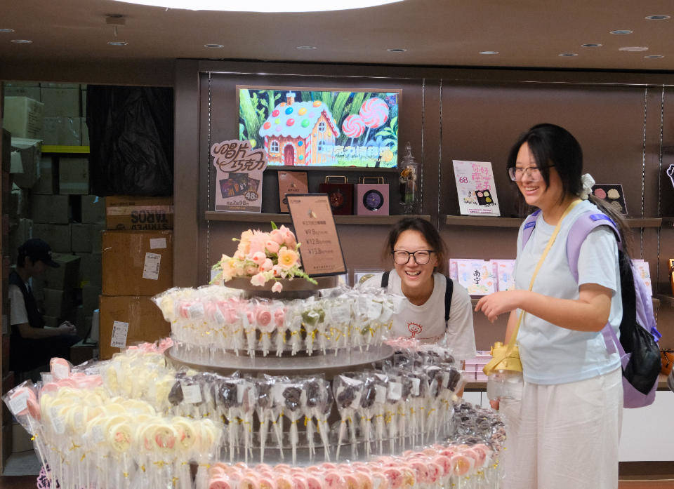 展厅内,游客们穿梭其间,或驻足细看展品细节,或与巧克力地标合影打卡,孩子们则围着展柜,好奇地观察着这些“能看不能吃”的巧克力珍品发出惊叹。不少游客打卡之余,还会品尝店内的巧克力,丝滑的口感搭配浓郁的香气,让人回味无穷。顾客开心地挑选巧克力棒棒糖。南国早报全媒体记者 冯榆 摄