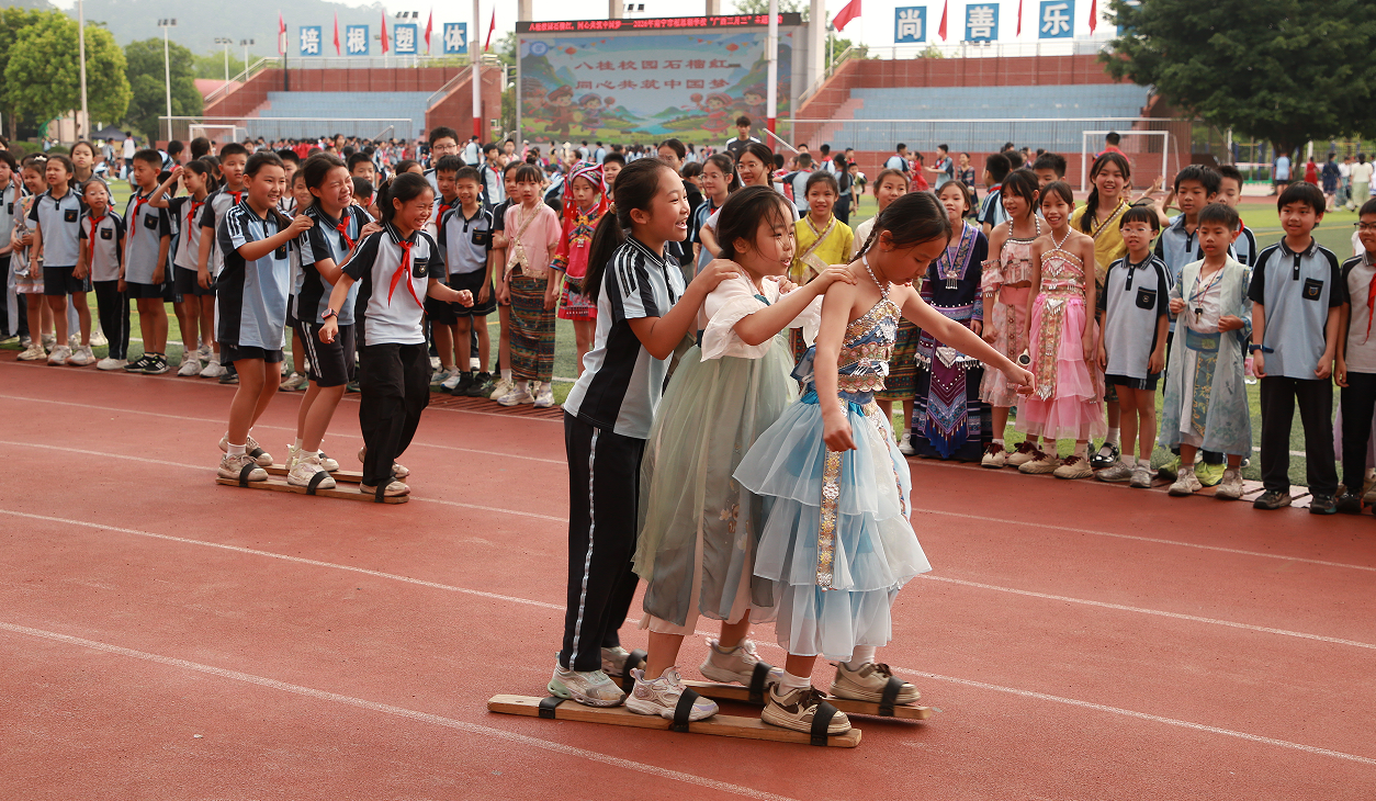 在山歌对唱环节,低年级学子演绎经典民谣,中高年级师生默契对唱,融入校园趣味新编,以歌传情、以曲会友,尽显广西的民俗风情。民族体育竞技现场热闹非凡,滚铁环、背篓赛跑、三人板鞋接力、高杆抛绣球、竹竿舞等轮番上演,师生在竞技中协作,在运动中凝聚,展现青春活力与民族体育独特魅力。