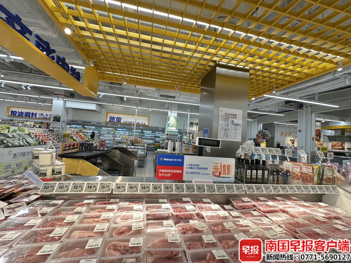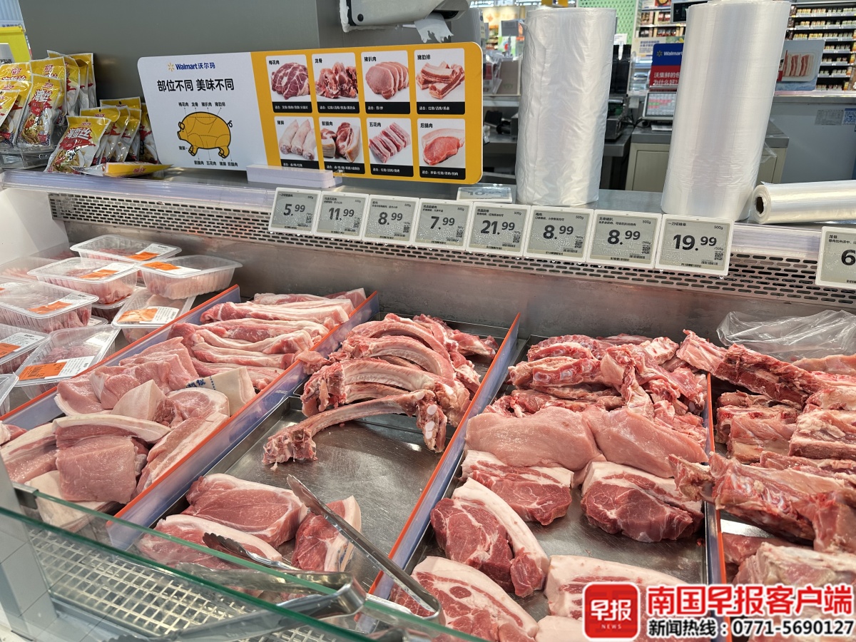 4月22日,记者在南宁市望州南路的沃尔玛超市看到,生鲜区内各类猪肉统一盒装分装、明码标价。现场标价显示,猪前腿肉11.98元/公斤,精瘦肉17.98元/公斤,即便价格偏高的猪肋排,售价也仅53.98元/公斤。