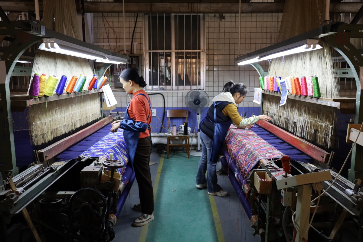 车间里,全自动壮锦提花机咔嗒作响,五彩丝线在机杼间穿梭。从业二十三载的厂长周腾靠自豪地说:“这台机器宽幅可达3.2米,是传统织机的10倍,以往不敢想的宽幅壮锦,现在轻松织就。”