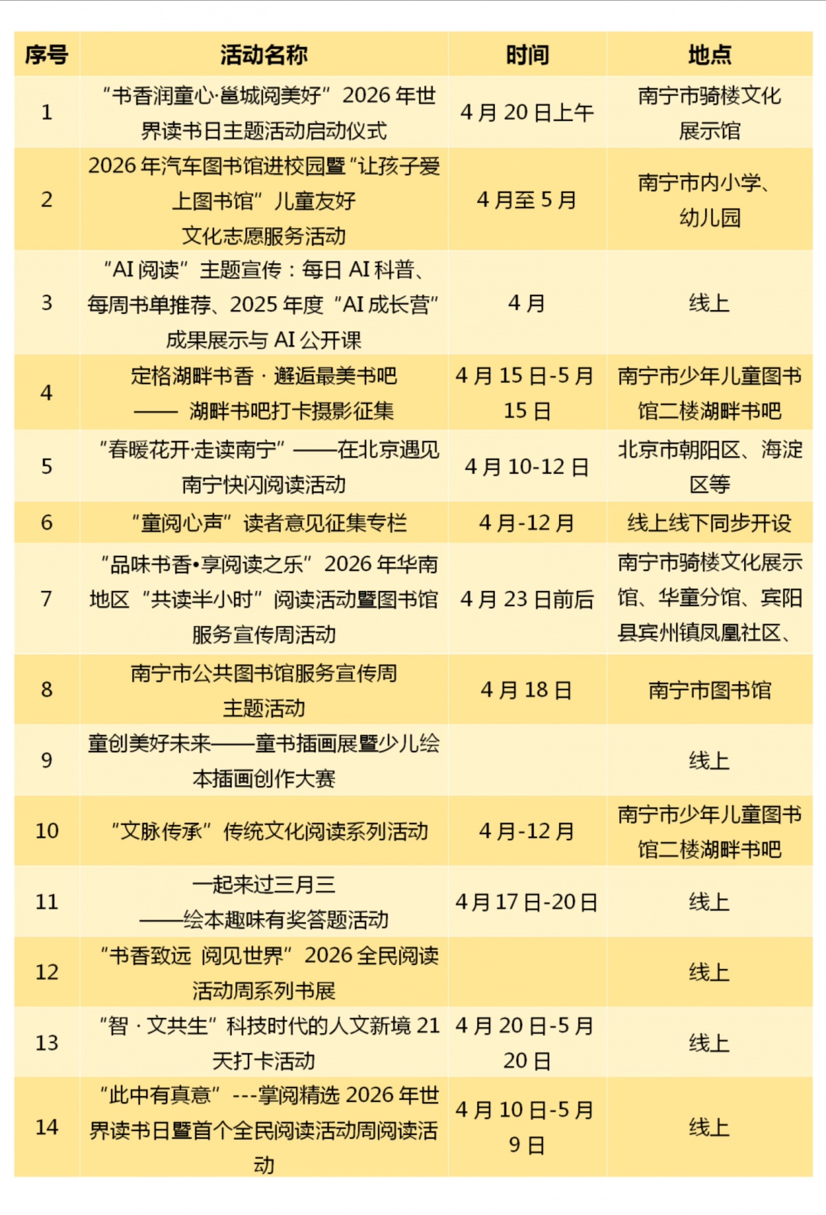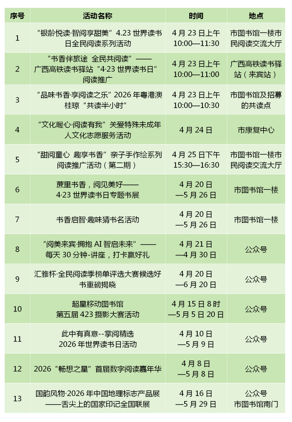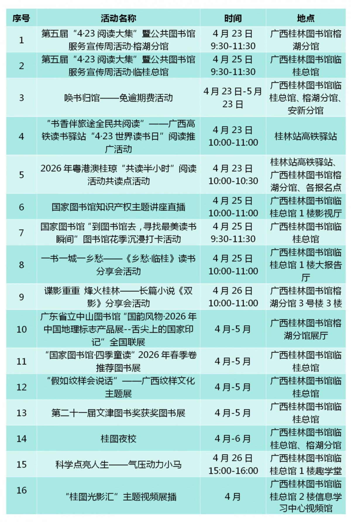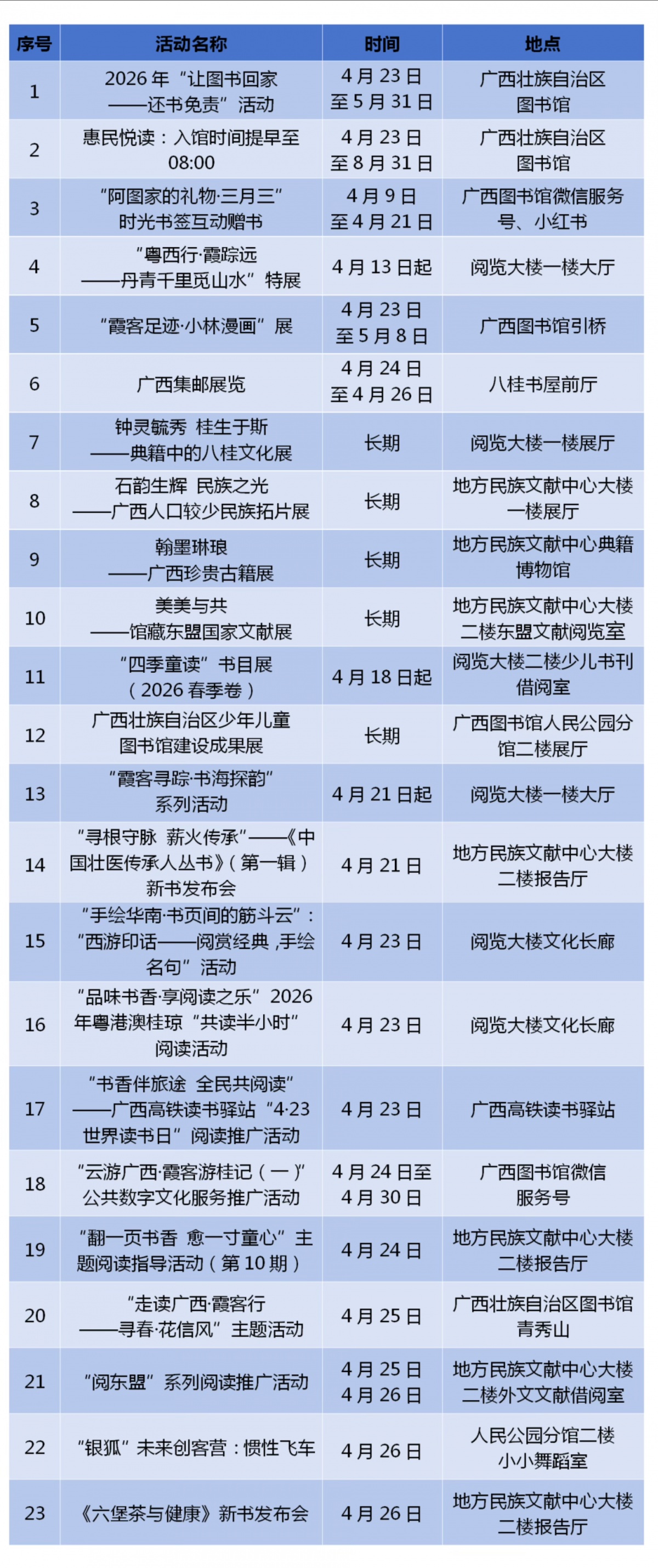 广西图书馆2026年“全民阅读活动周”将持续至4月26日,推出多项暖心惠民举措。4月23日至5月31日,“让图书回家——还书免责”活动开启,凡活动期间到馆归还逾期图书的读者,一律免收逾期费用。同时,4月23日至8月31日,图书馆入馆时间由9:00提前至8:00,进一步延长服务时长。