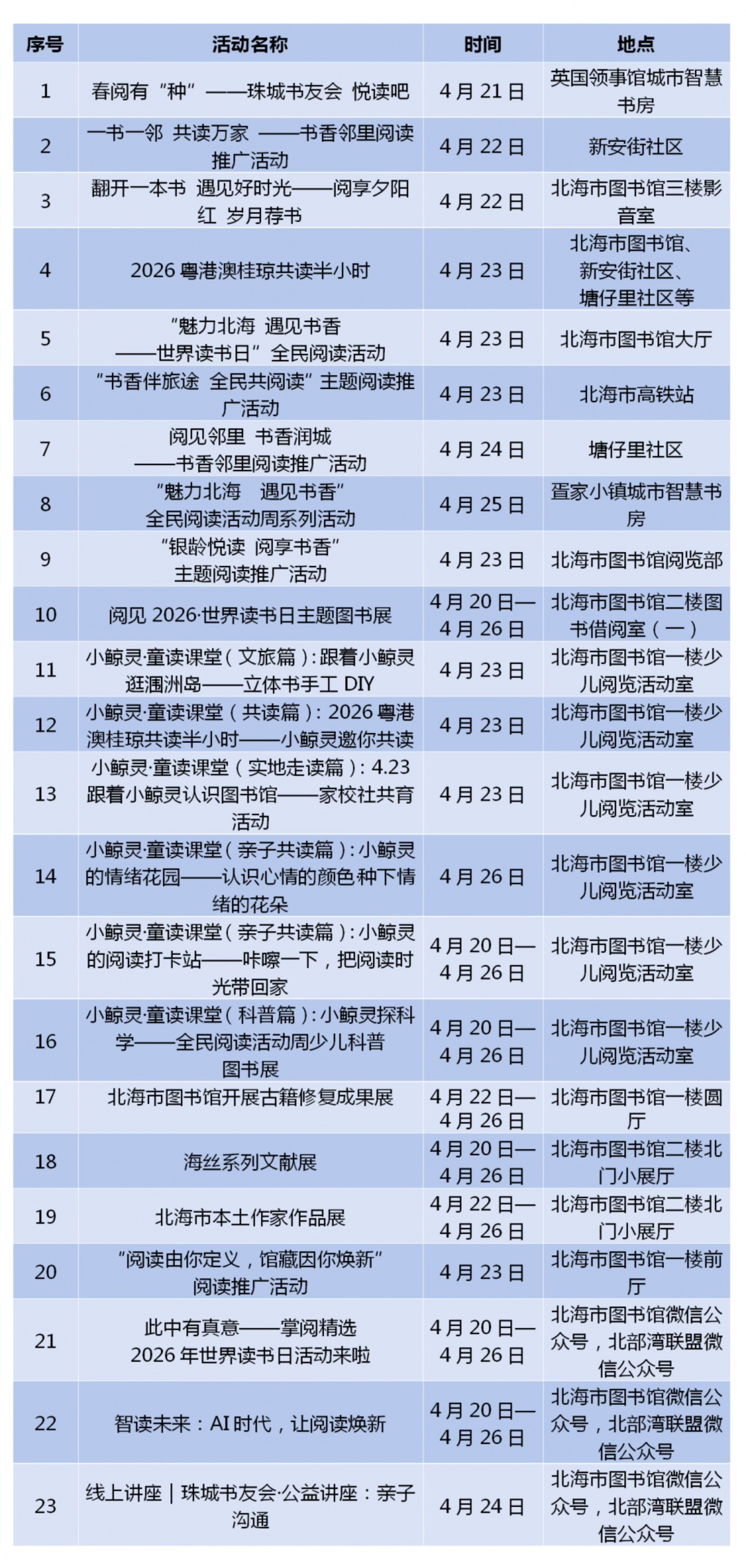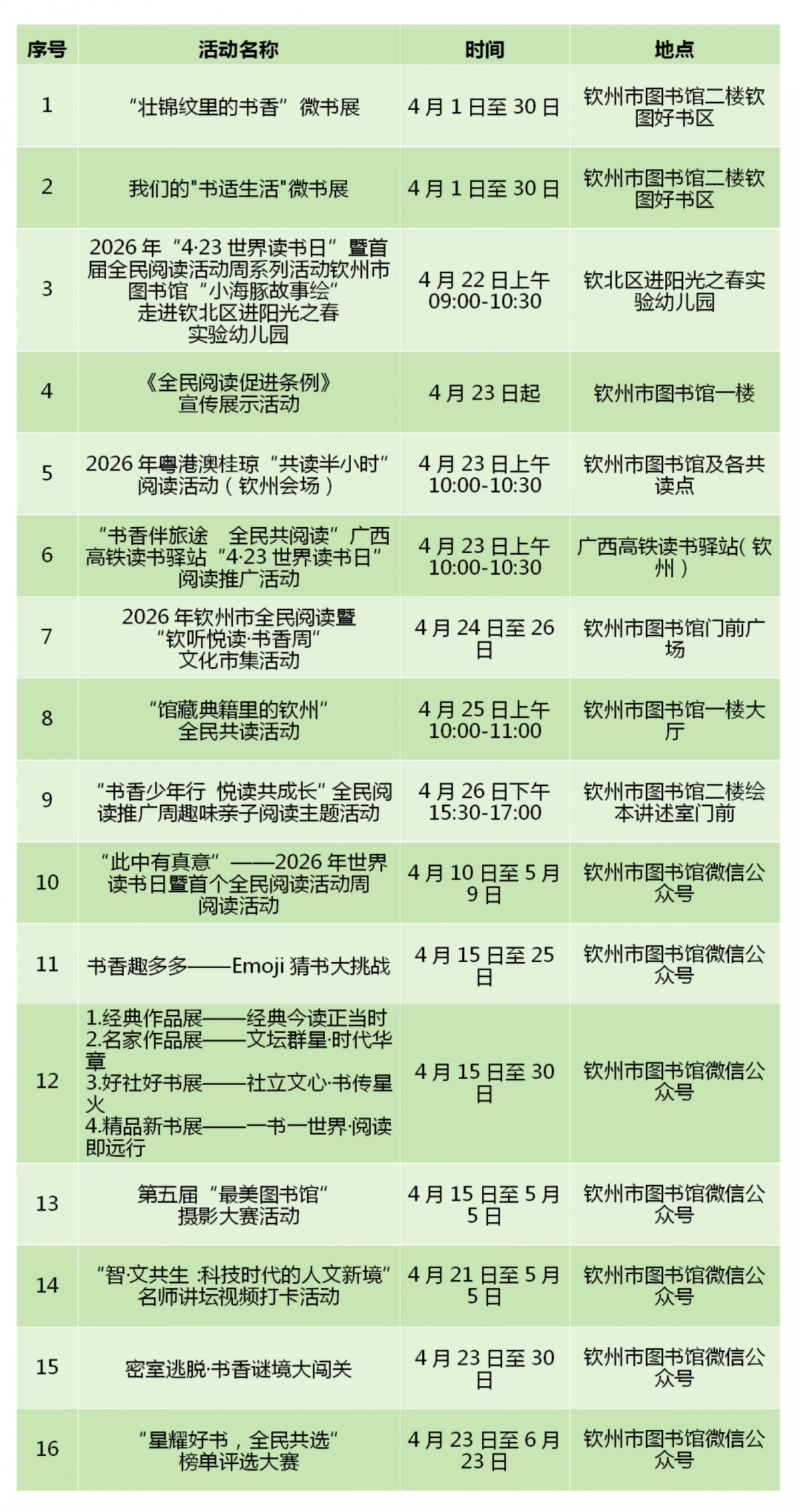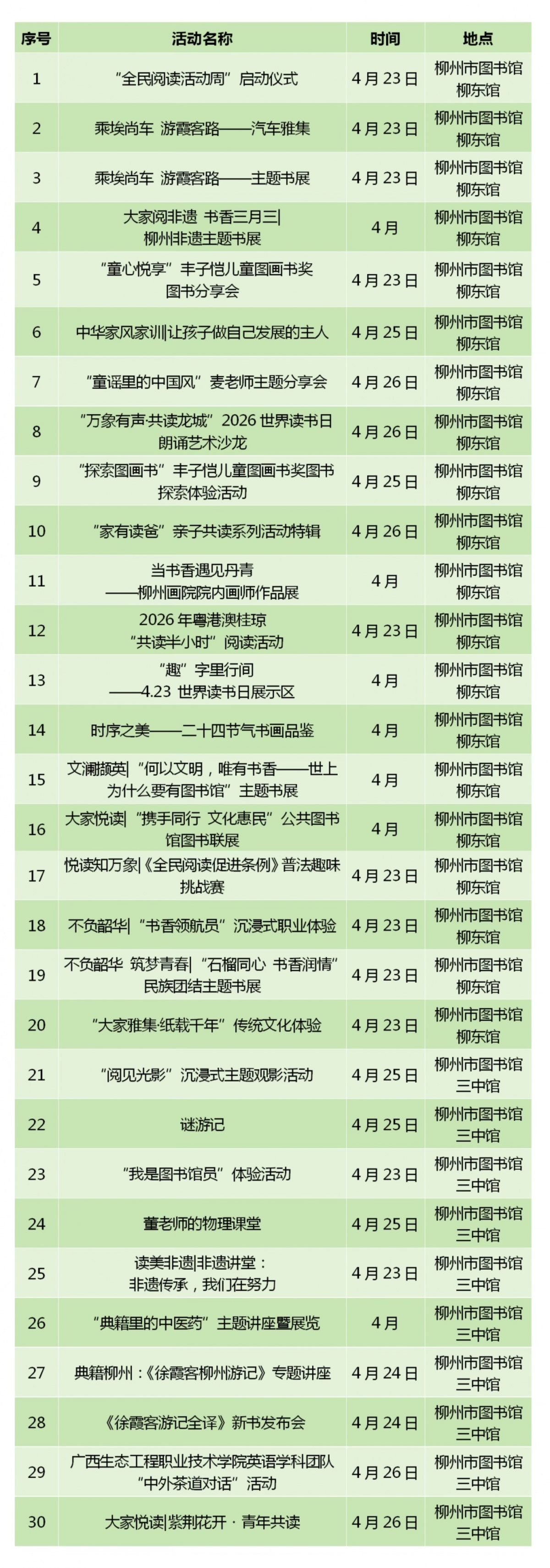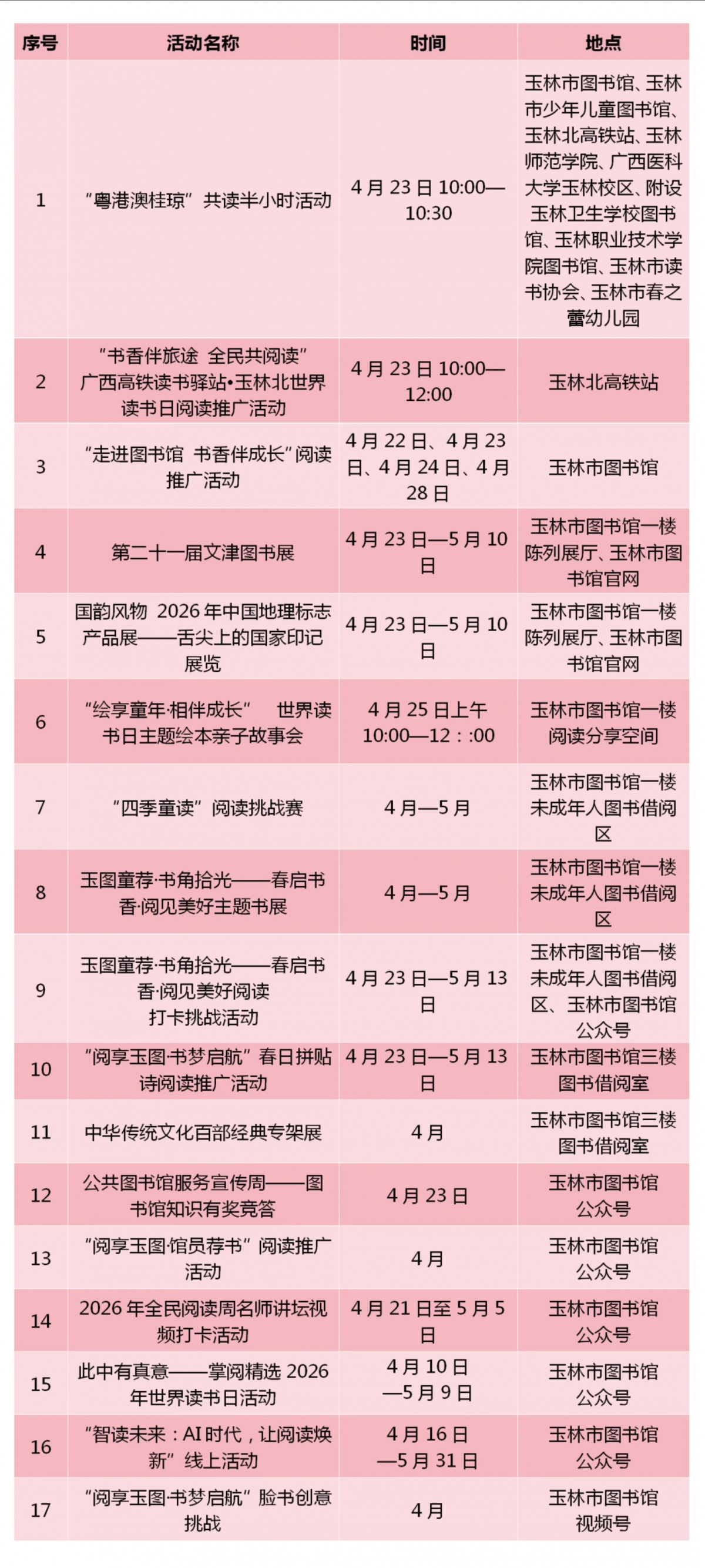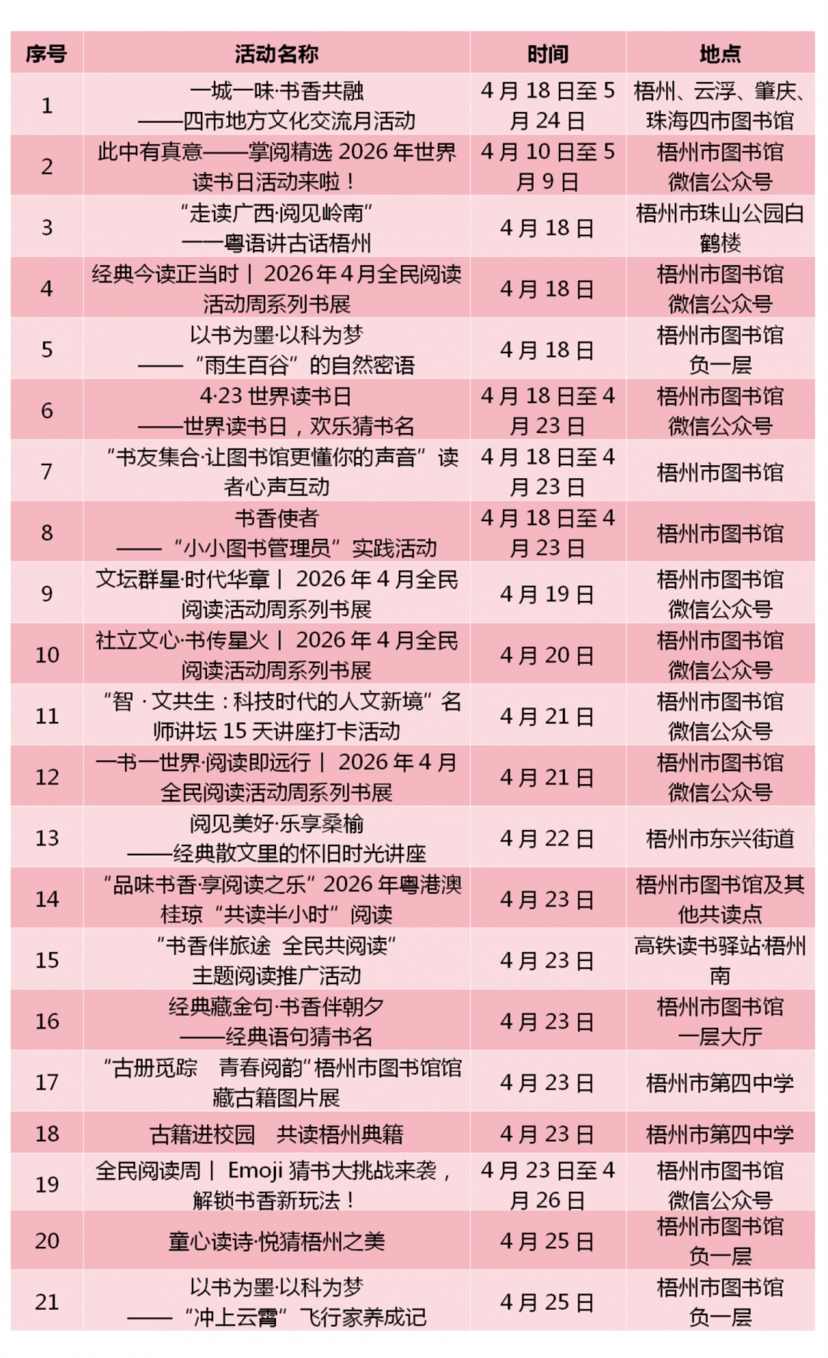 广西图书馆2026年“全民阅读活动周”将持续至4月26日,推出多项暖心惠民举措。4月23日至5月31日,“让图书回家——还书免责”活动开启,凡活动期间到馆归还逾期图书的读者,一律免收逾期费用。同时,4月23日至8月31日,图书馆入馆时间由9:00提前至8:00,进一步延长服务时长。