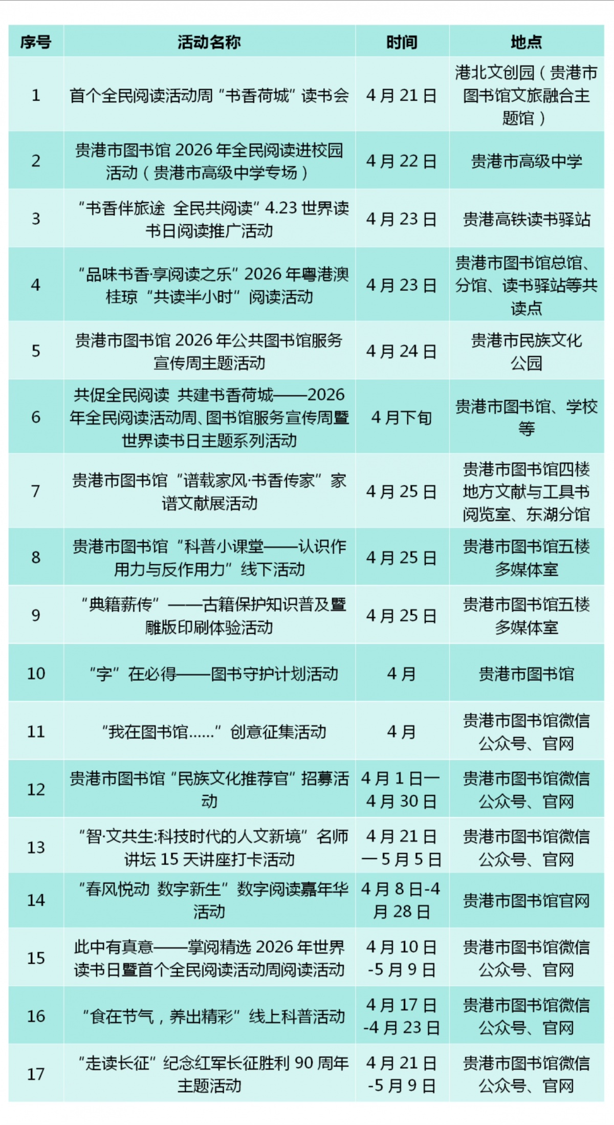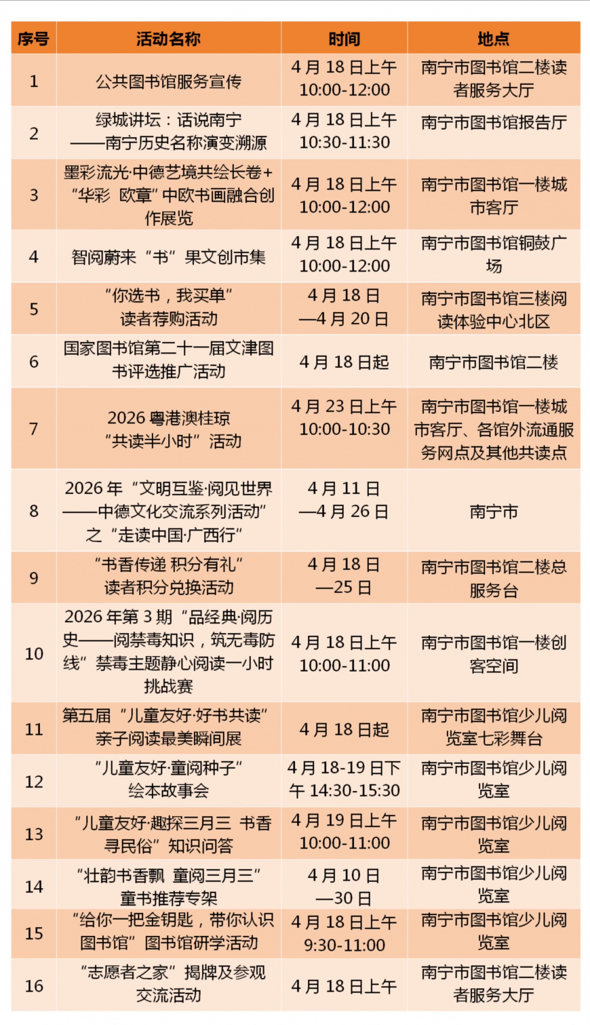 本次阅读活动周实现全区联动,活动期间,南宁市图书馆、柳州市图书馆、桂林图书馆等全区各市级图书馆同步发力,推出主题展览、文创市集、亲子共读、文化体验等丰富活动。读者可就近选择图书馆参与,近距离感受书香八桂的独特魅力。