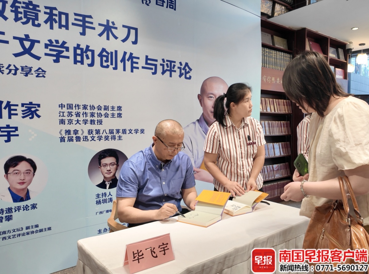 分享会上,毕飞宇对广西文学给予高度评价。他表示,过去二十年,广西文学发展势头迅猛,以东西、鬼子、凡一平等为代表的广西作家群体,对当下和未来的广西文学所起到的作用是巨大的,“可以说这一波人把广西的当代文学推到了一个很高的高度”。