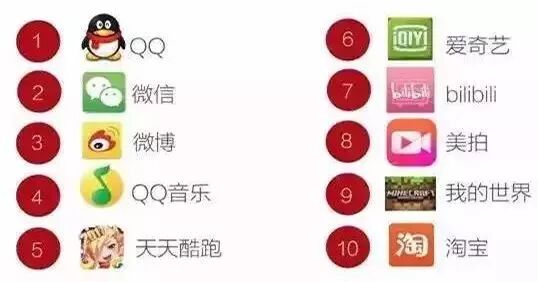 根据某应用市场2016年8月发布的《00后App使用情况调研报告》,00后最常用的APP前十名分别是:QQ、微信、微博、QQ音乐等。
