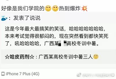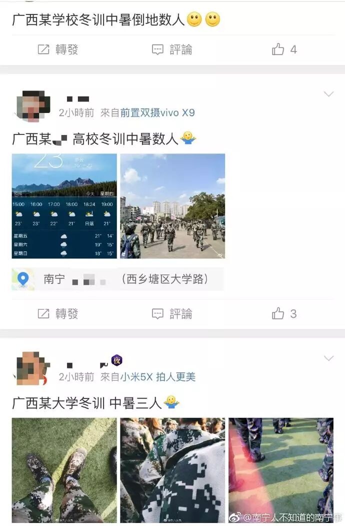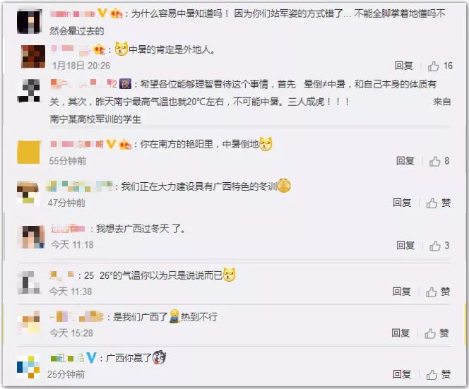 经广西某大学学生向其中一位“中暑”学生确认后,证明并无此事。该同学只是由于未吃早饭,从而在训练的过程中感到有些头晕。随后这所大学武装部也在各军训营里发声明说:学生军训中暑实属无中生有,并表示将对还继续转发该不实消息的人从严处理。