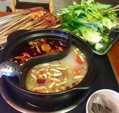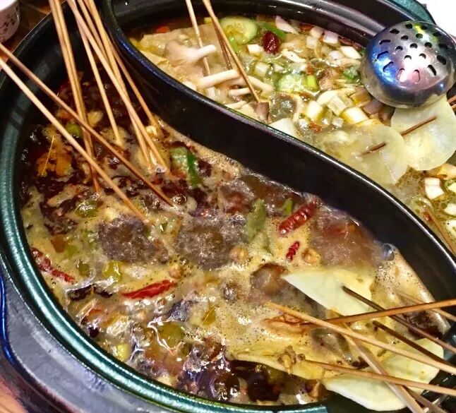 砂锅串串,真的极适合冬天吃,撸串时就像烤火一样,可以选择鸳鸯锅底,辣锅烫肉,清汤锅烫青菜。
