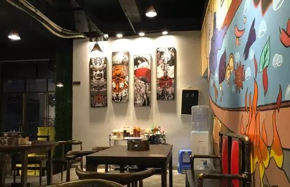 店内装修风格是简单的工业涂鸦风格,桌椅摆放得很宽松,坐进去不会觉得拥挤。店里每张桌子都配着一个炭火炉子,蛮特别的,有种小时候家里打边炉的感觉。