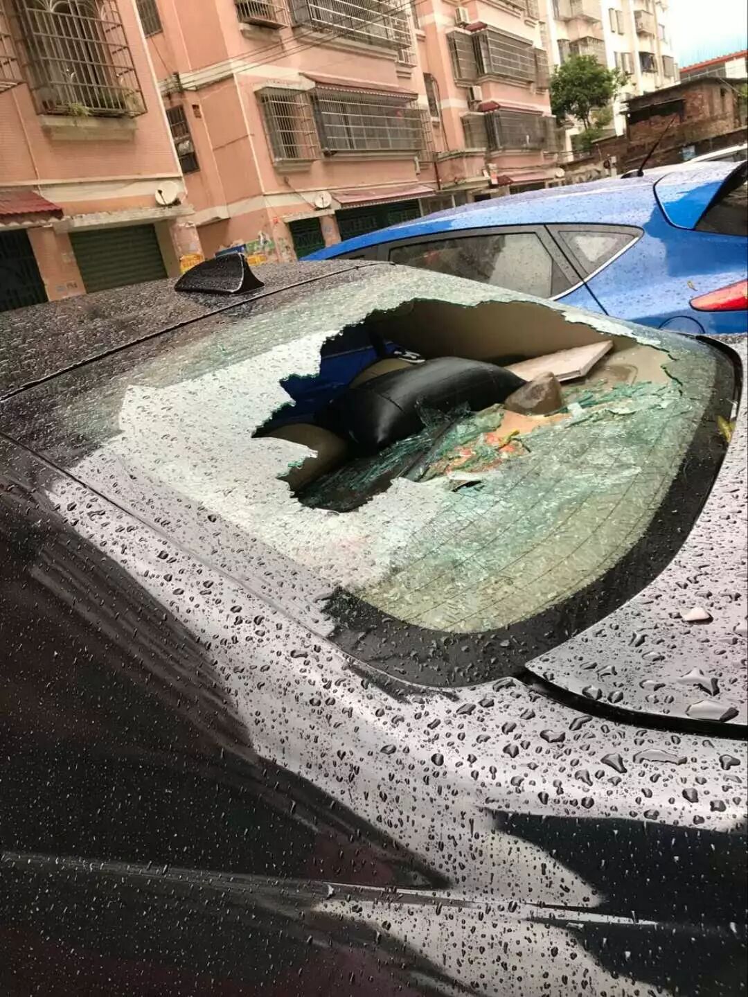 不少汽车挡风玻璃被砸烂了,车顶上也现出不少凹坑,大的冰雹有鸡蛋那么大。