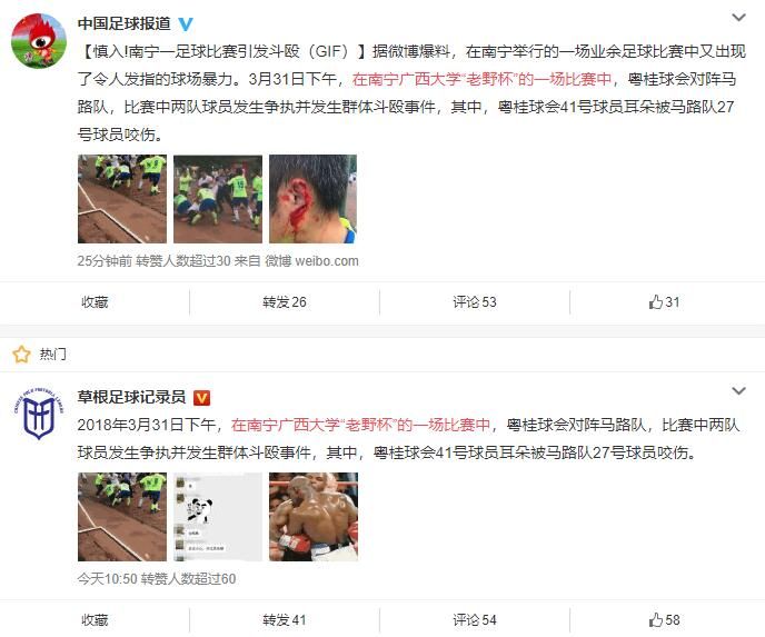 3月31日下午, 在南宁一场业余足球赛中 ,两队球员发生群体斗殴事件,有球员耳朵被咬烂。