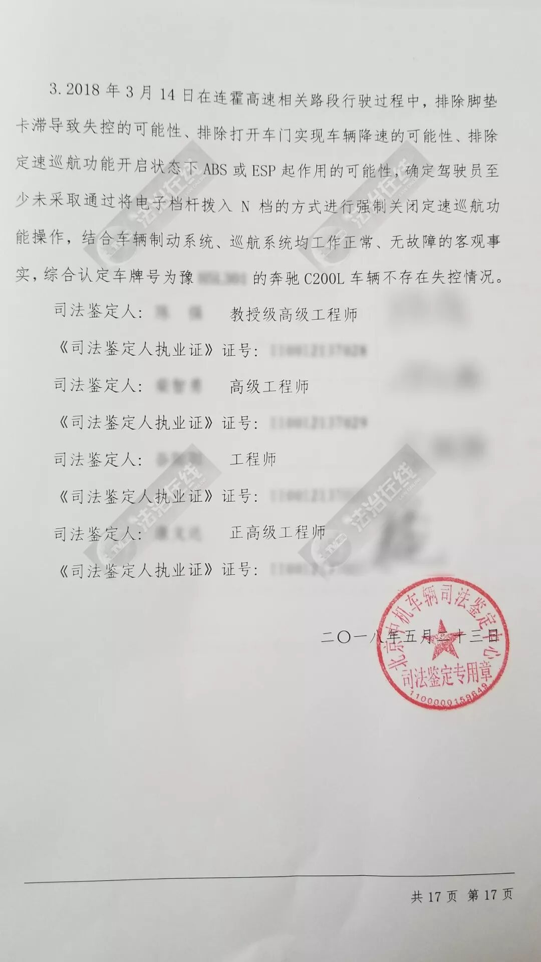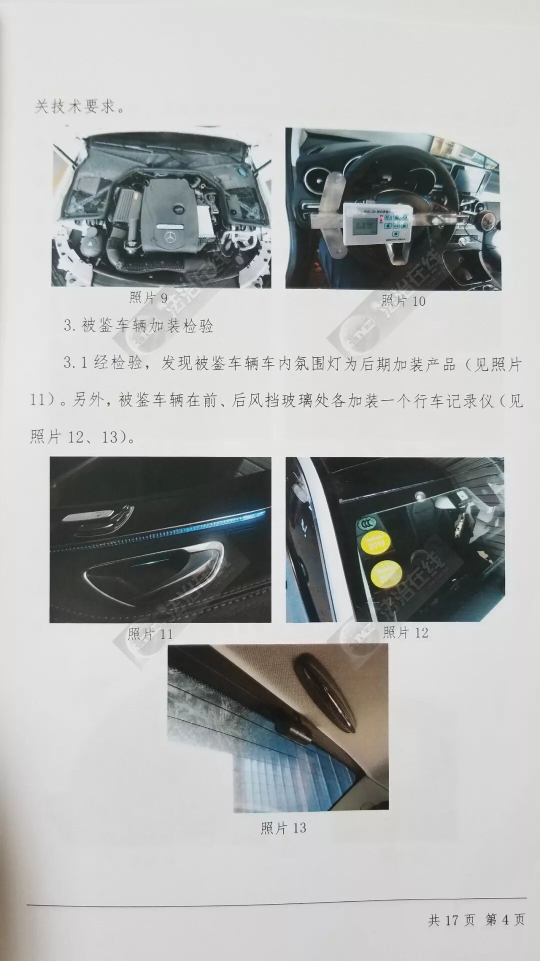 2018年5月26日,也就是4月27日开始对车辆进行检测后一个月,奔驰车主薛先生收到了检测机构北京中机车辆司法鉴定中心快递来的司法鉴定意见书。如下↓↓↓