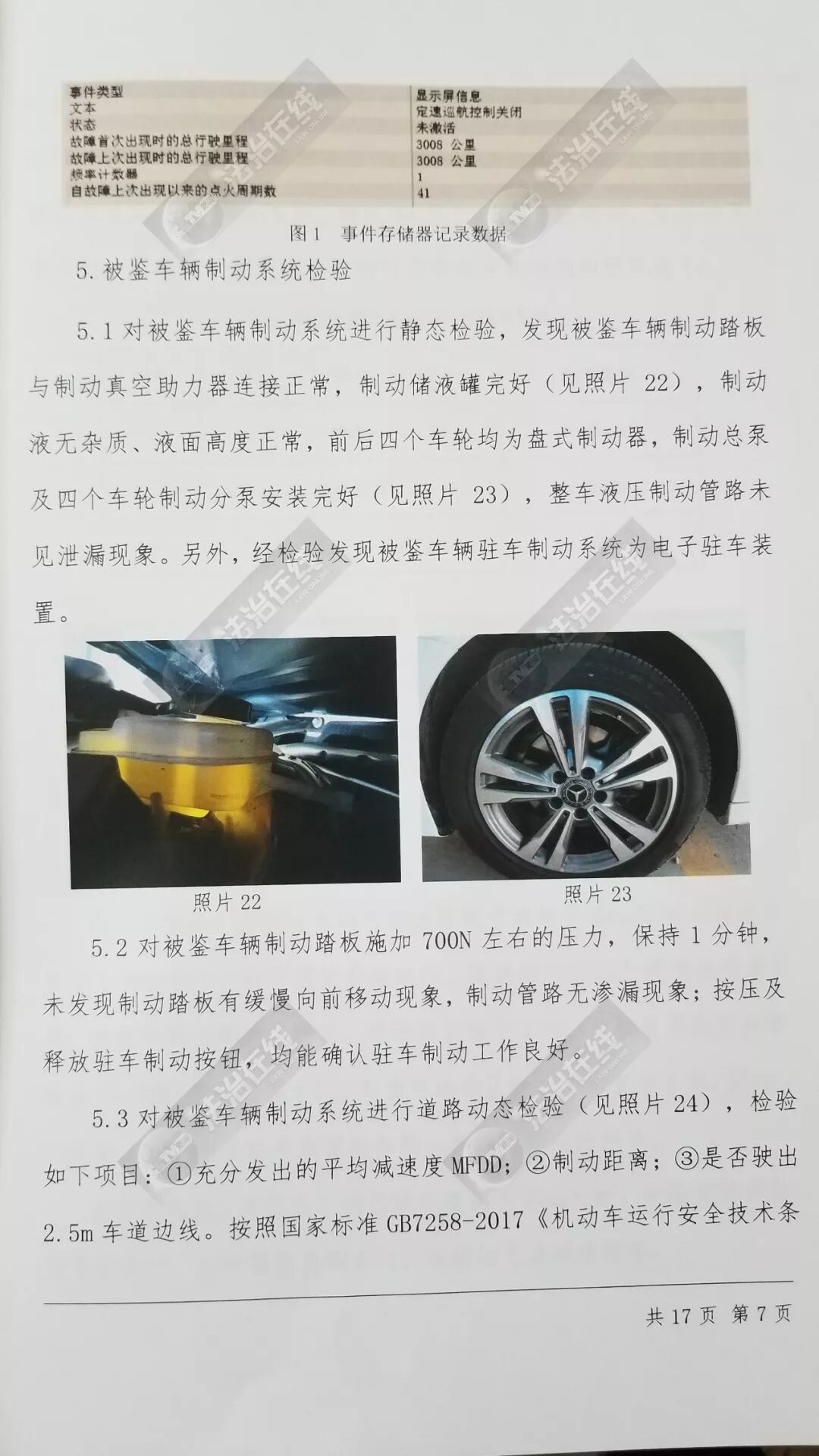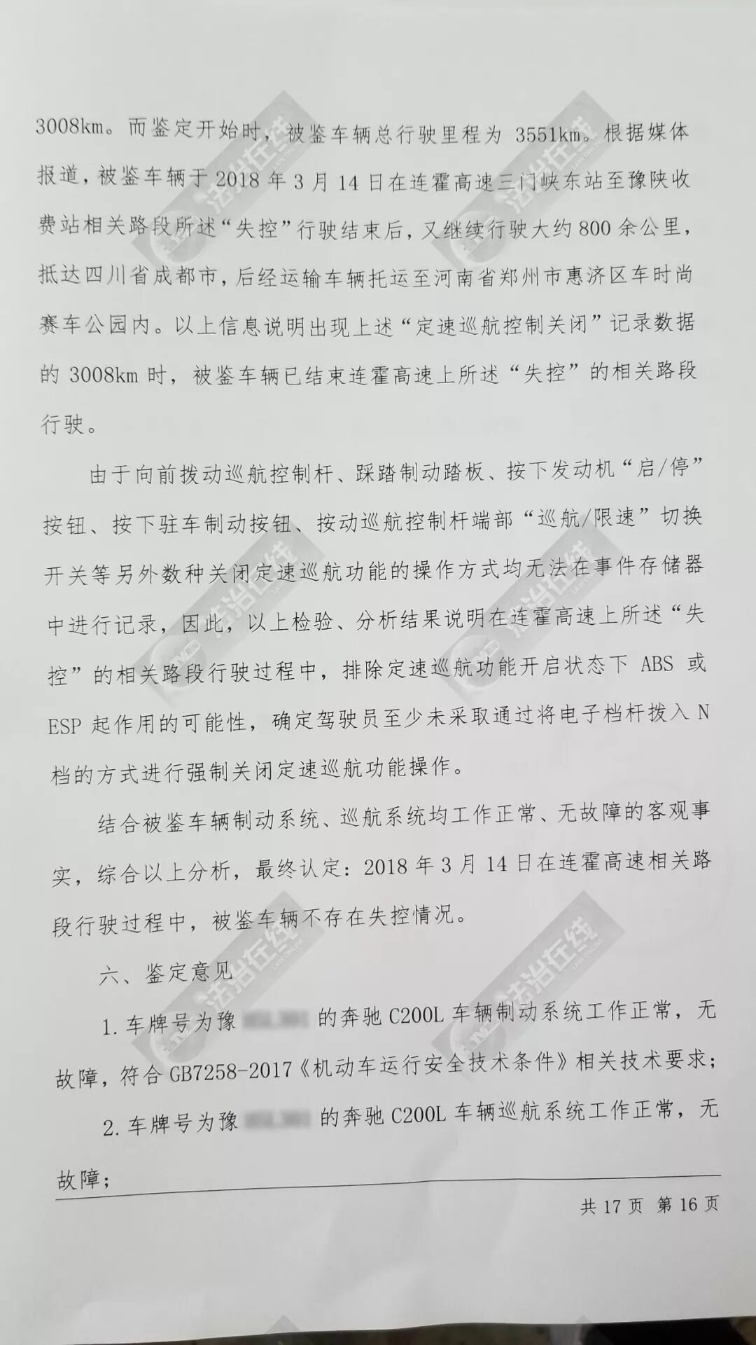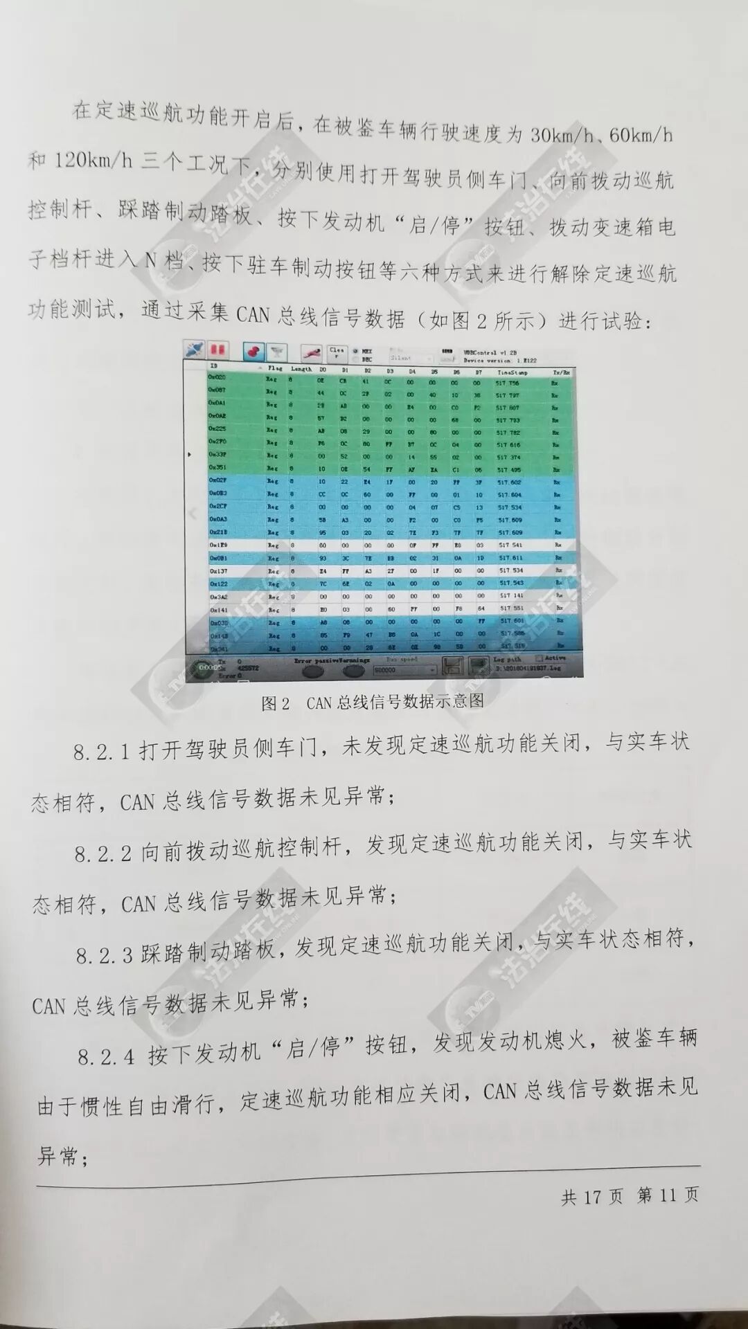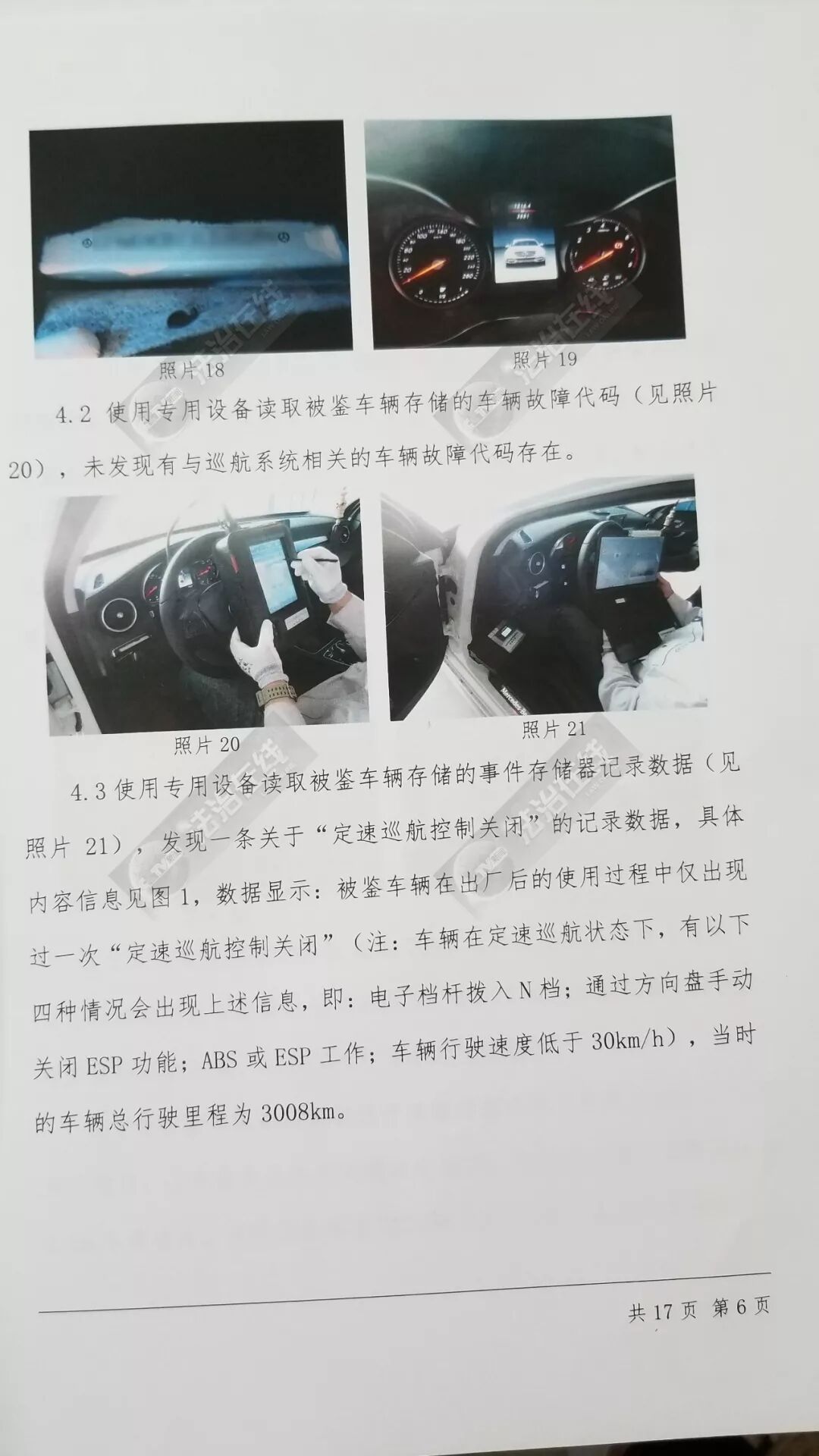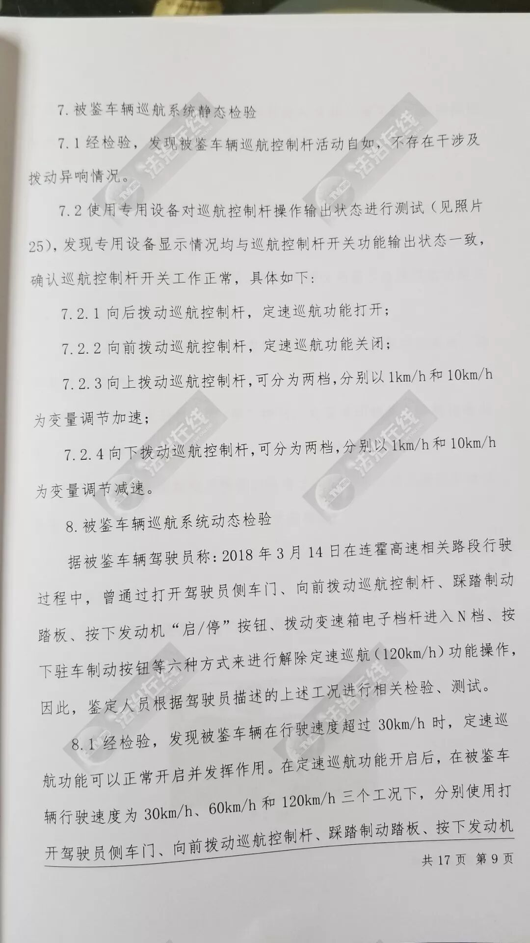 司法鉴定意见书显示,在车辆存储的事件存储器记录数据,发现了一条关于“定速巡航控制关闭”的记录数据,该数据显示,车辆在出厂后仅出现过一次“定速巡航控制关闭”,出现上述记录的车辆总行驶里程为3008km,而鉴定开始时,车辆总行驶里程3551km,车主事发后,从华阴收费站行驶大约800余公里到达成都,也就是说,出现“定速巡航控制关闭”的记录数据,是发生在事发后车主从华阴收费站到成都的路上。