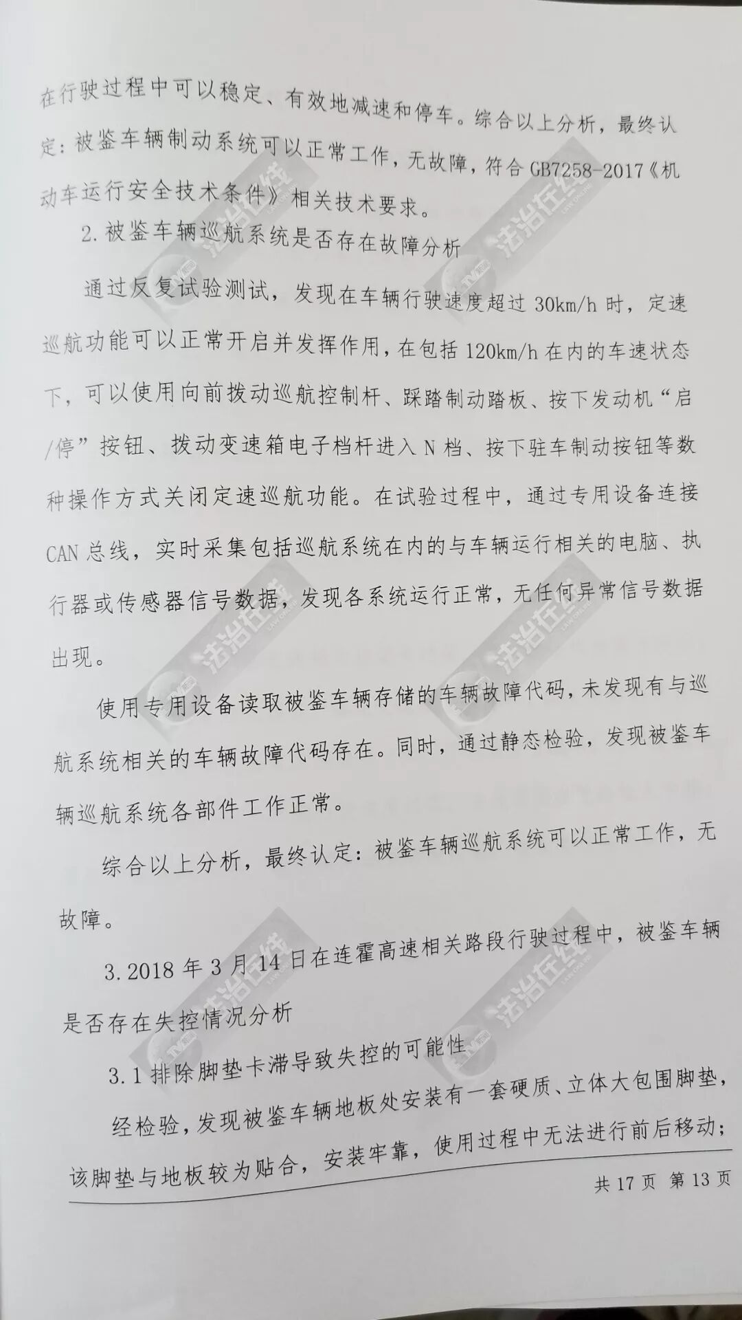 司法鉴定意见书认定,2018年3月14日在连霍高速相关路段行驶过程中,排除脚垫卡滞导致失控的可能性、排除定速巡航功能开启状态下ABS或ESP起作用的可能性,确定驾驶员至少未采取通过将电子挡杆拨入N挡的方式进行强制关闭定速巡航功能操作,结合车辆制动系统、巡航系统均工作正常、无故障的客观事实,综合认定车辆不存在失控情况。