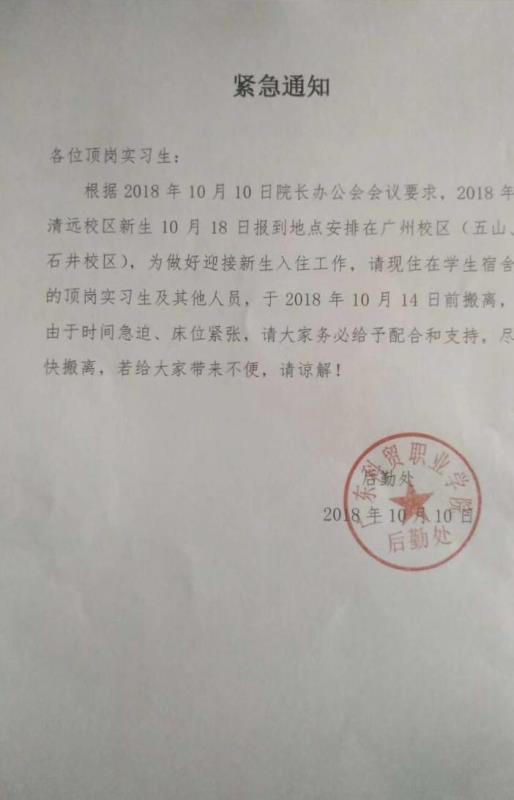 据学生提供的信息,10月10日,广东科贸职业学院后勤处下发《紧急通知》显示,根据10月10日院长办公会会议要求,2018级清远校区新生10月18日报到地点安排在广州校区(五山、石井校区),为做好迎接新生入住工作,请现住在学生宿舍的定岗实习生及其他人员于10月14日前搬离。由于时间急迫、床位紧张,请大家务必给予配合和支持。