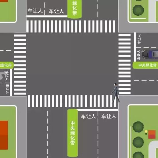 当道路两侧有绿化带,行人走斑马线还未穿过绿化带时,紧贴绿化带车道的车辆需要停车让行;当行人走斑马线已穿过绿化带时,所有车道的车辆都必须停车让行。