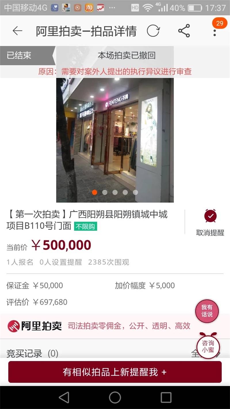 ▲1月10日,平乐县法院撤回此商铺的拍卖。网络截图