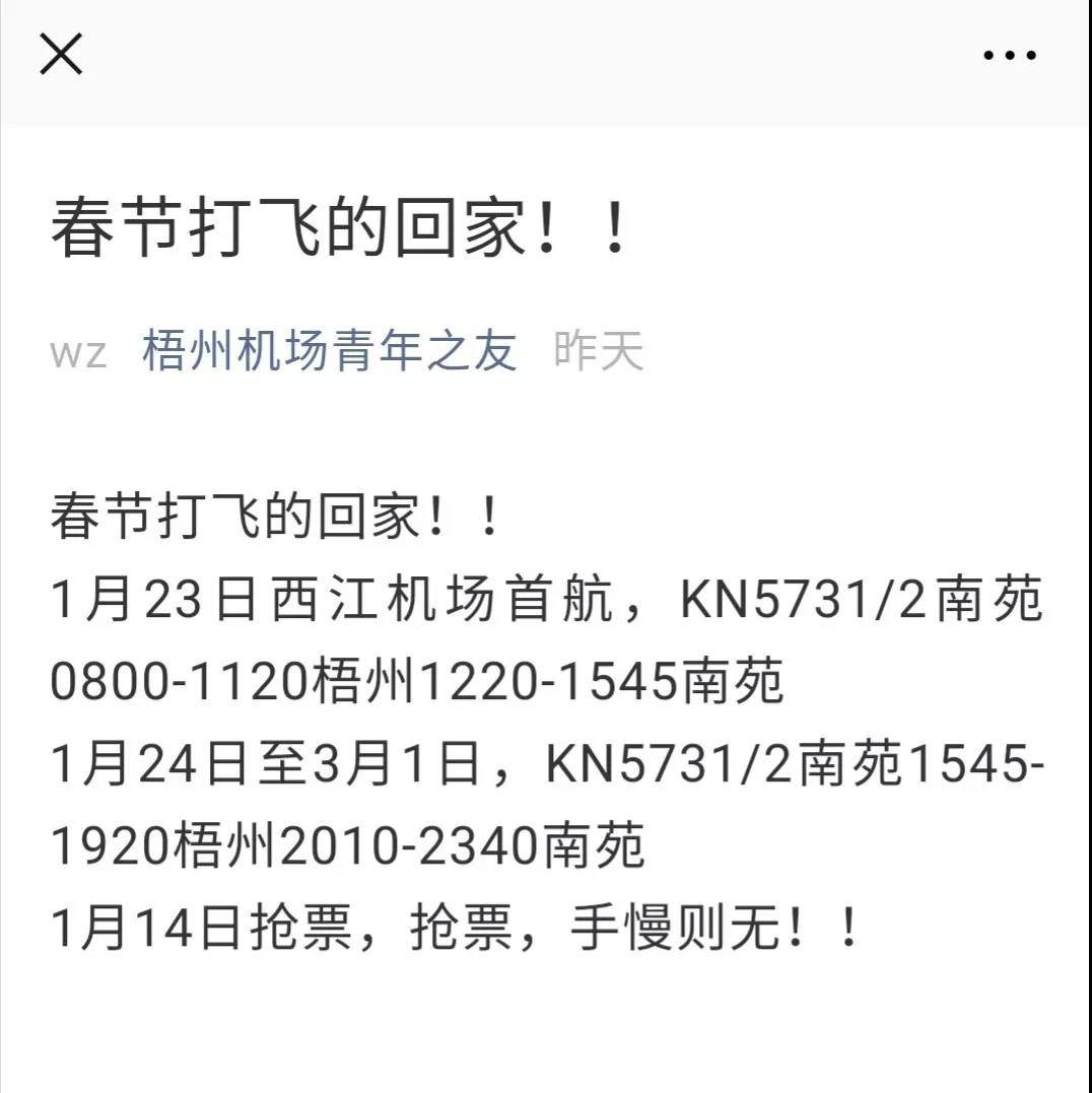相信很多小伙伴们兴奋不已,尤其是在外工作的梧州朋友们,今年春节可以打“飞的”回家啦!