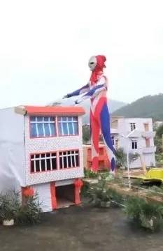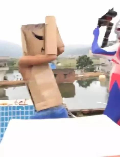 “战斗服”是贴了胶带的旧衬衣,“沥青马路”是灰色的屋顶天台,被毁掉的“民居”全是瓦楞纸箱,“白瓷墙”则是将A4纸剪成小块,手工拼贴而成……至于打斗特效,大概连5毛钱的预算都没有,火箭筒射出的“炮弹”其实是莲藕,而奥特曼的“大招”,竟是一块滑动的红布条。